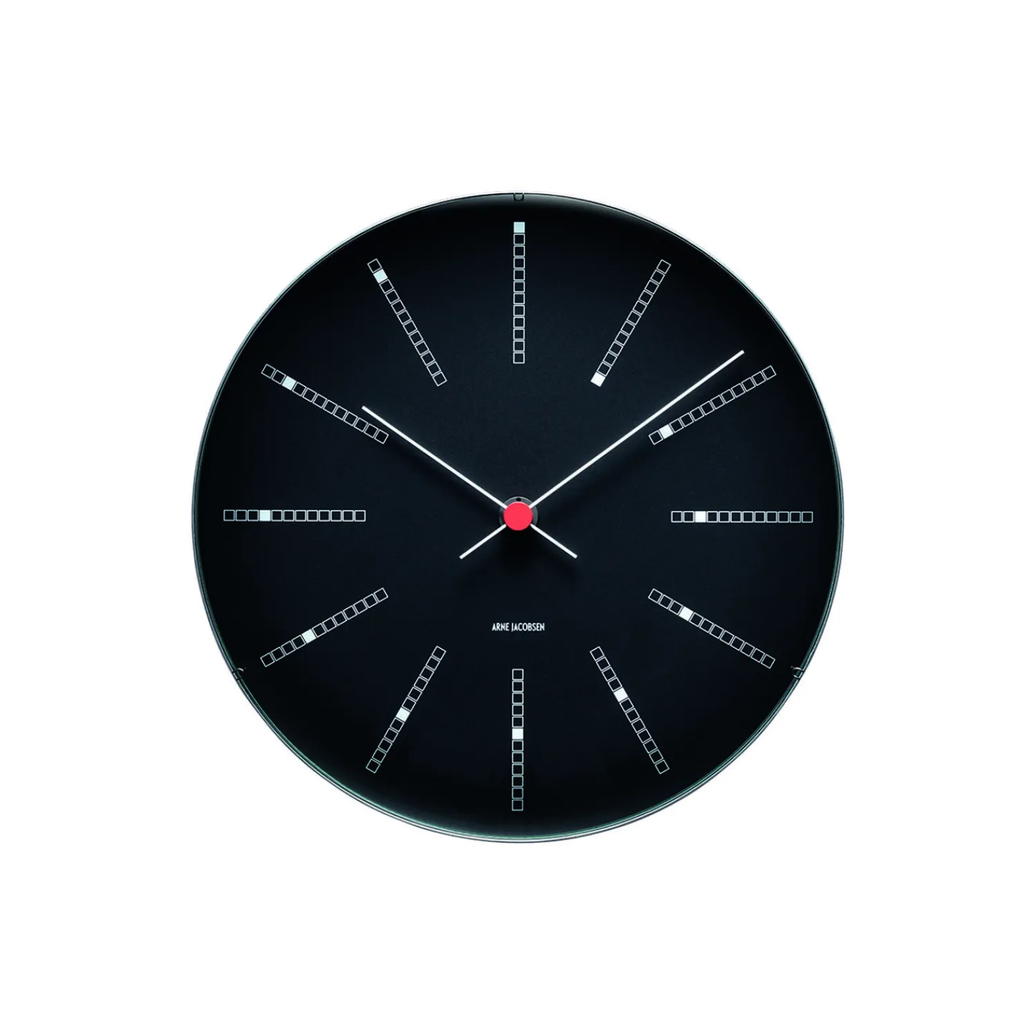 Det stilrene Bankers vægur i sort fra Arne Jacobsen Clocks måler 21 cm i diameter. Designet er klassisk med et twist af små, kreative detaljer, som den elegante spiral der illustrerer tidens gang hele uret rundt. Bankers-uret er oprindeligt skabt til brug i Nationalbanken i 1971, men nu kan alle få glæde af det minimalistiske design i eget hjem. Her får du et lækkert og tidløst design-ur med masser af kant til din indretning. Uret fås også i en model med Ø29.