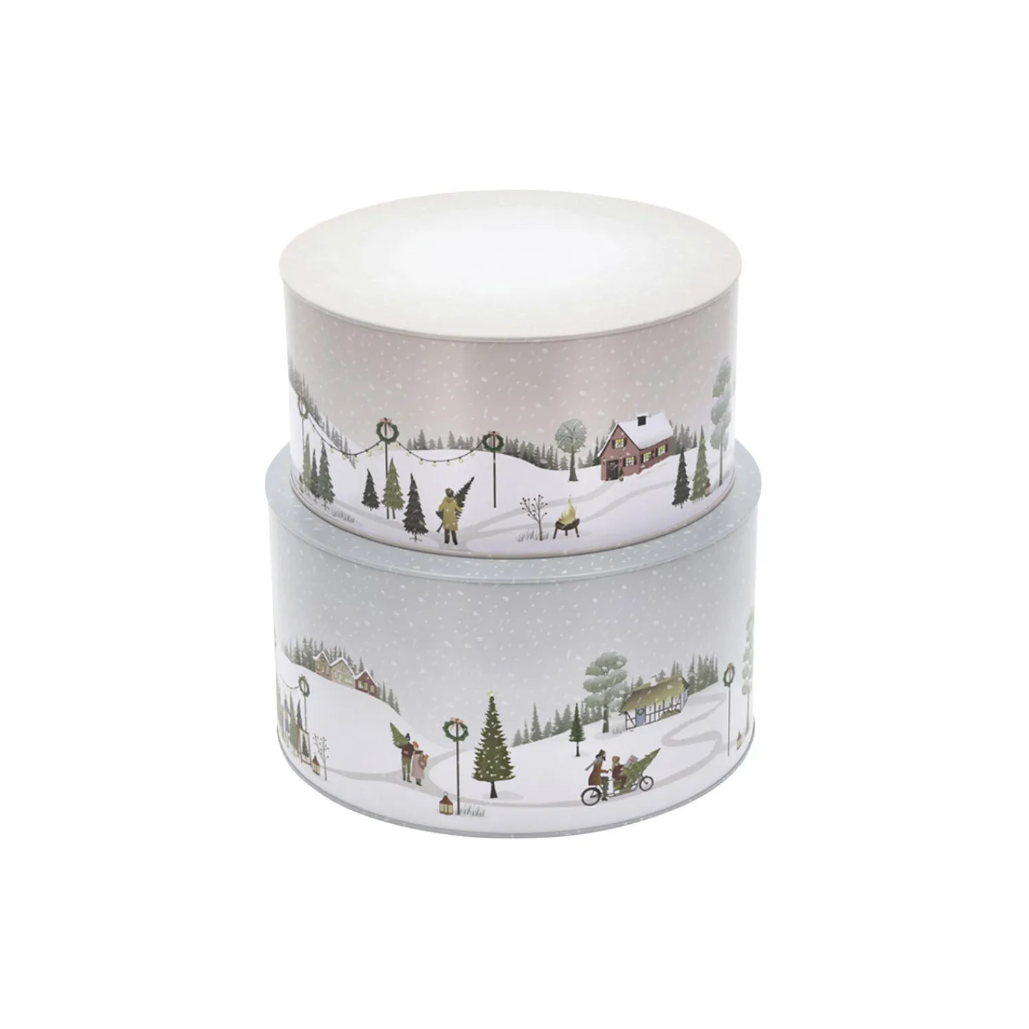 Kagedåsesættet med de skønne illustrationer, som går igen på Pillivuyts hyggelige Vinter stel, består af to fine metaldåser. Den store dåse, dia. 22 cm, H 12 cm, har farven Arctic Ice, og indeni ligger en mindre dåse, dia. 20 cm, H 10 cm, i farven Woodrose.