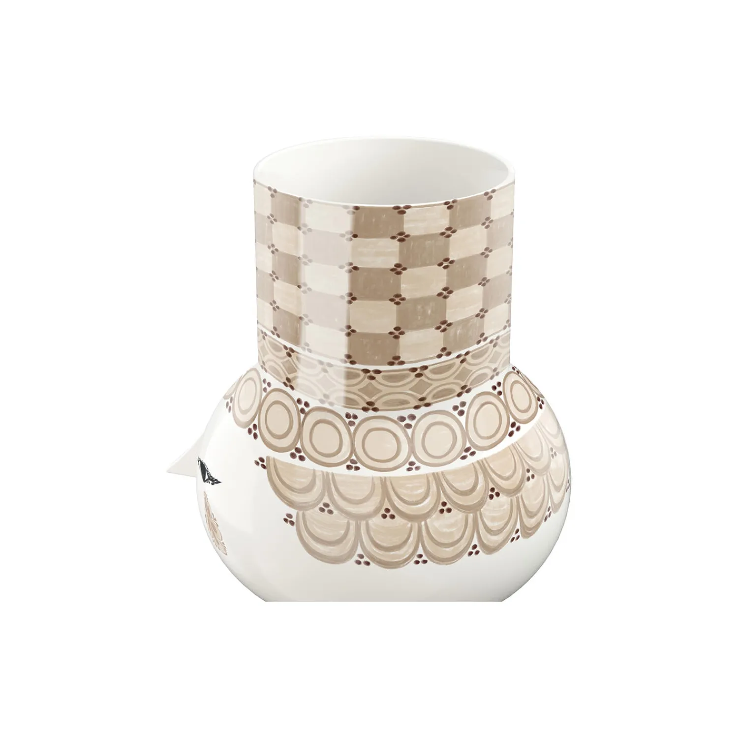Udfold din farverige personlighed og lad kreativiteten blomstre med Bjørn Wiinblads Olga. Med sit glade smil, de blussende kinder og farverige dekorationer rummer Olga på alle måder essensen af Bjørn Wiinblad som person og kunstner – også når hun tager form som vase. Glad og drømmende skaber hun liv og personlighed i indretningen med sit poetiske udtryk og sine sprudlende farver. Olga-vasen er en nyfortolkning af en ikonisk vase, som Bjørn Wiinblad lavede i samarbejde med den keramiske fabrik Nymølle. Den har den samme cylindriske top som vasen fra Bjørn Wiinblads imponerende designarkiv og prydes af et sødt rundt ansigt med de mandelformede øjne og den ikoniske trekantede næse, der nok nærmest er selve personificeringen af Bjørn Wiinblads kunst. Den største vase i serien måler hele 35 cm i højden og smiler i al sin storslåede skønhed til os smukt dekoreret i en dæmpet sandfarve med støvede røde prikker. Alle Olga-vaser er lavet af skinnende glaseret keramik med farverige decals, og dekorationerne er en skøn blanding af originale Bjørn Wiinblad-mønstre, der i en skøn varieret farvepalet giver dig et moderne og friskt udtryk. Bjørn Wiinblad var en livsglad kunstner med en stor og farverig personlighed, der gik sine egne veje og ikke var bange for at drømme og tænke stort. Den sjæl mærkes også til fulde i Olga, der hviler i sig selv og inviterer os til at udtrykke vores egen stil og personlighed i indretningen med farverige blomsterbuketter, eksotiske planter og kreative dekorationer. En ting er sikkert: Det bliver ikke kedeligt, når Olga flytter ind.