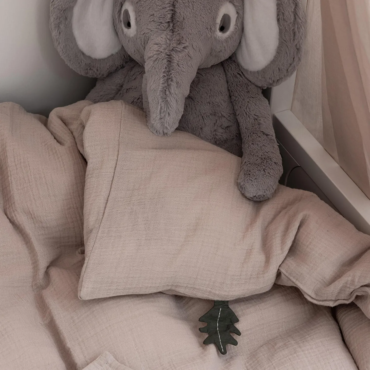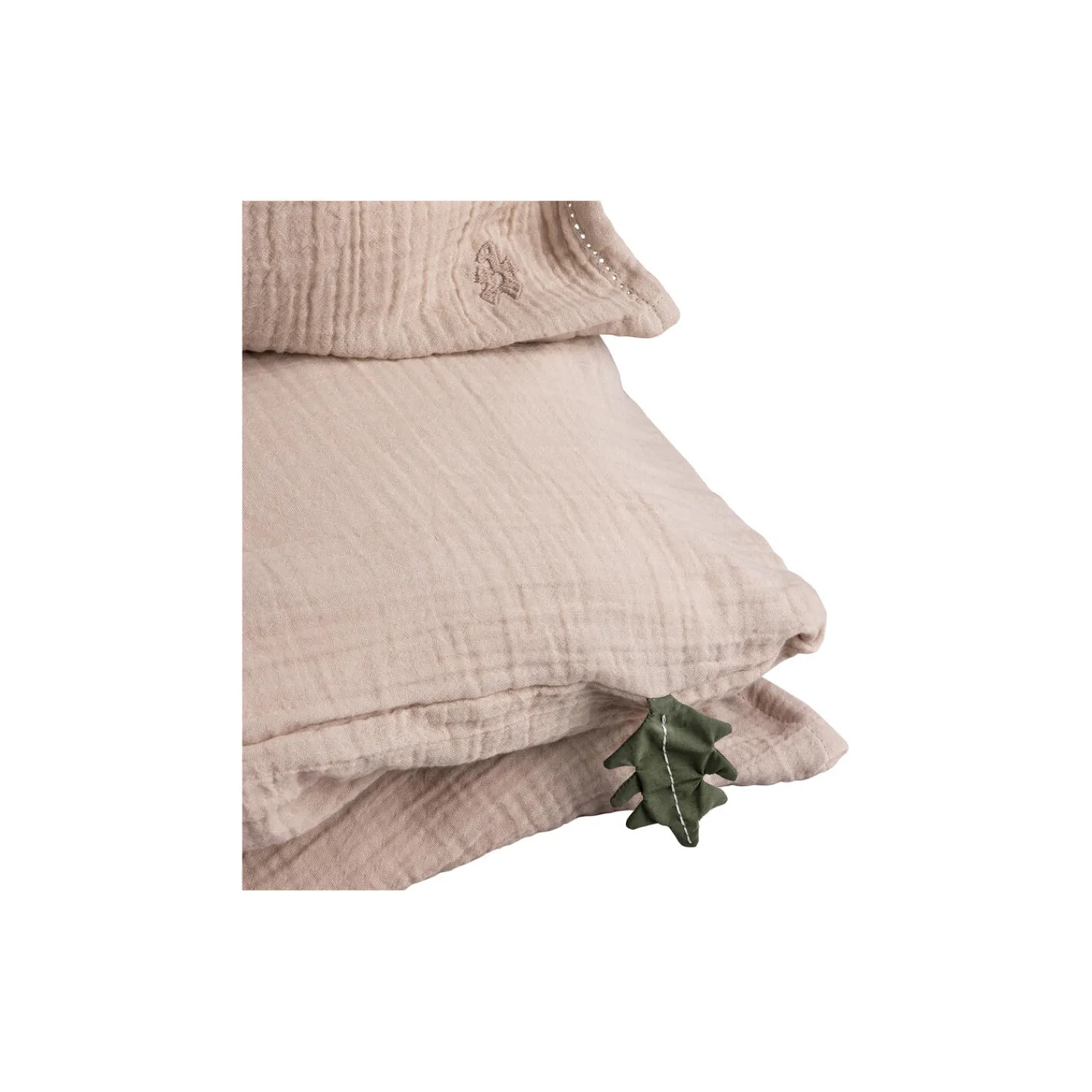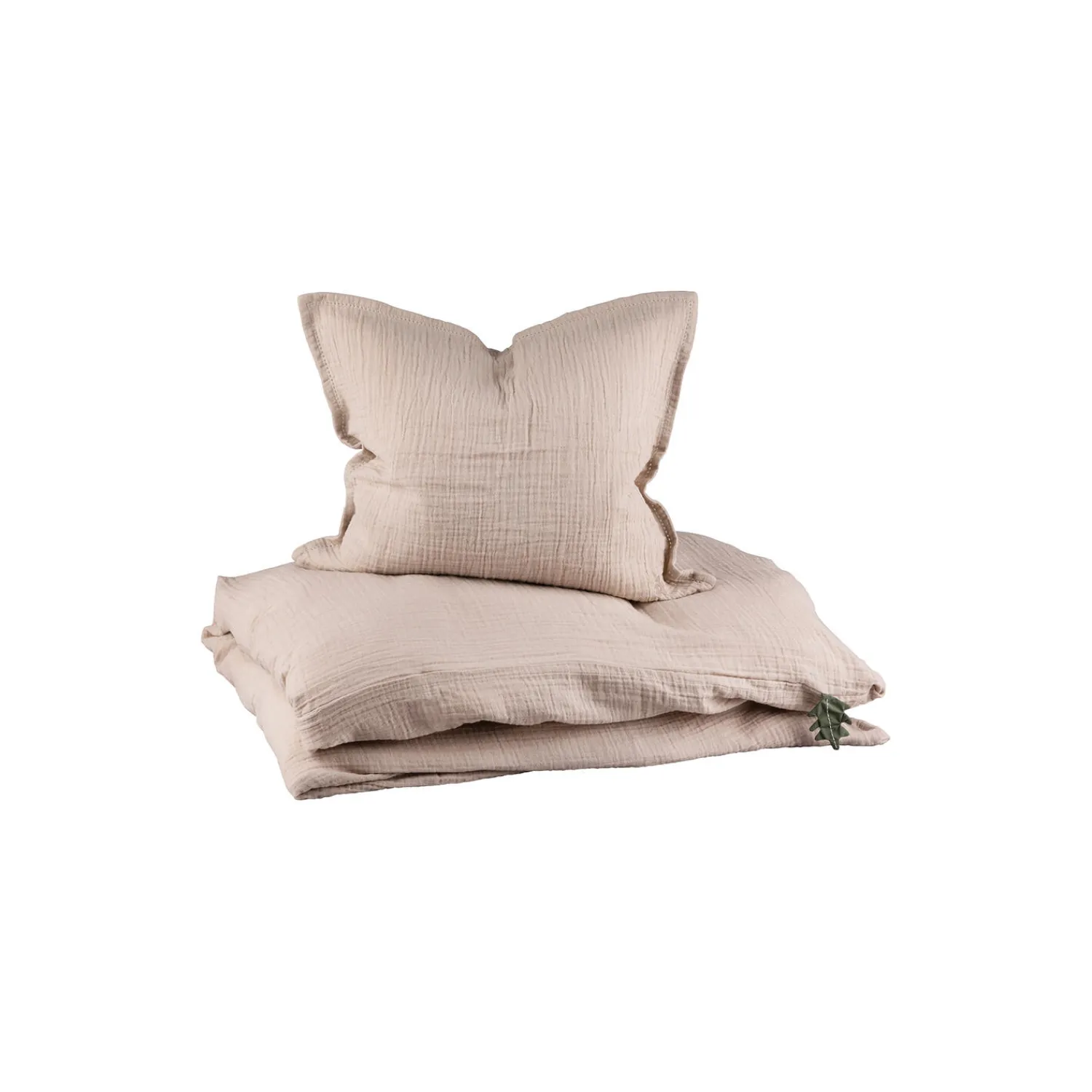 Lækkert juniorsengetøj fremstillet af certificeret økologisk bomuld i farven Seabreeze beige og dekoreret med en sød hulsøm i kanten.