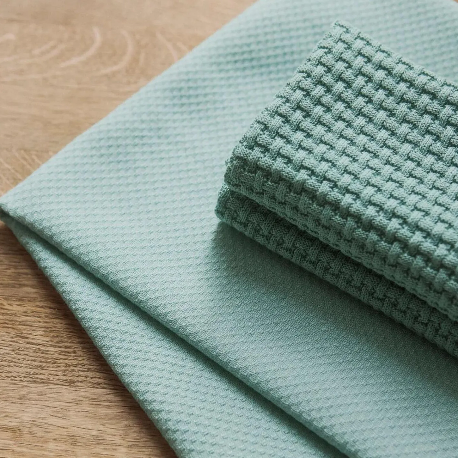 1959 er et klassisk, vævet køkkenhåndklæde i blød bomuld. Køkkenhåndklædets særlige, vaflede struktur sikrer en optimal tørreevne, og den kraftige kvalitet gør det muligt at bruge det både som håndklæde og viskestykke. Den klare, blågrønne farve, Deep Glass, er inspireret af farven på råglas.