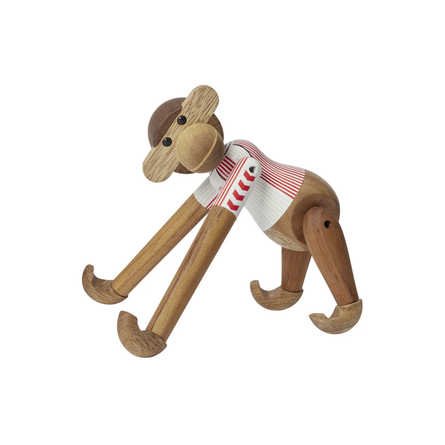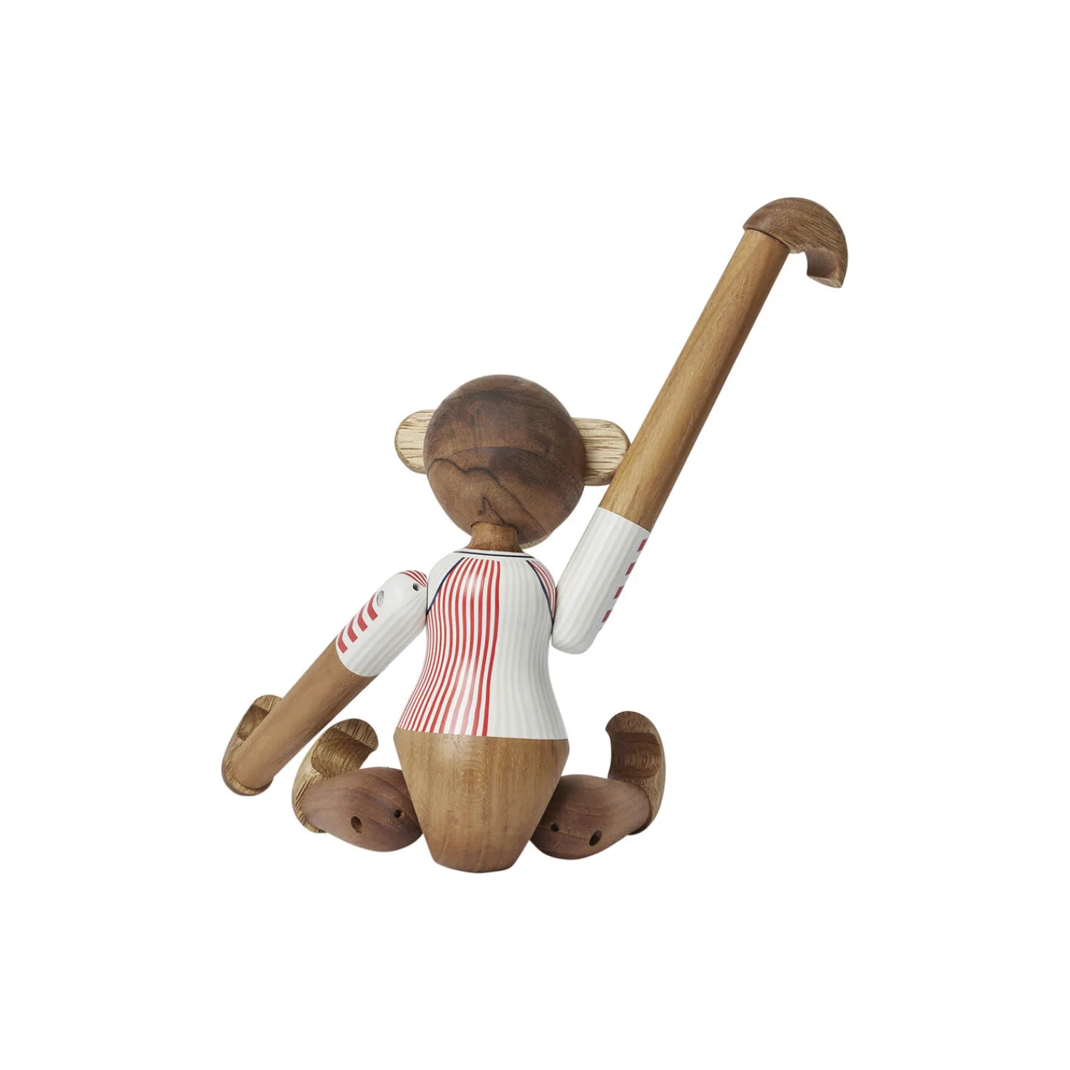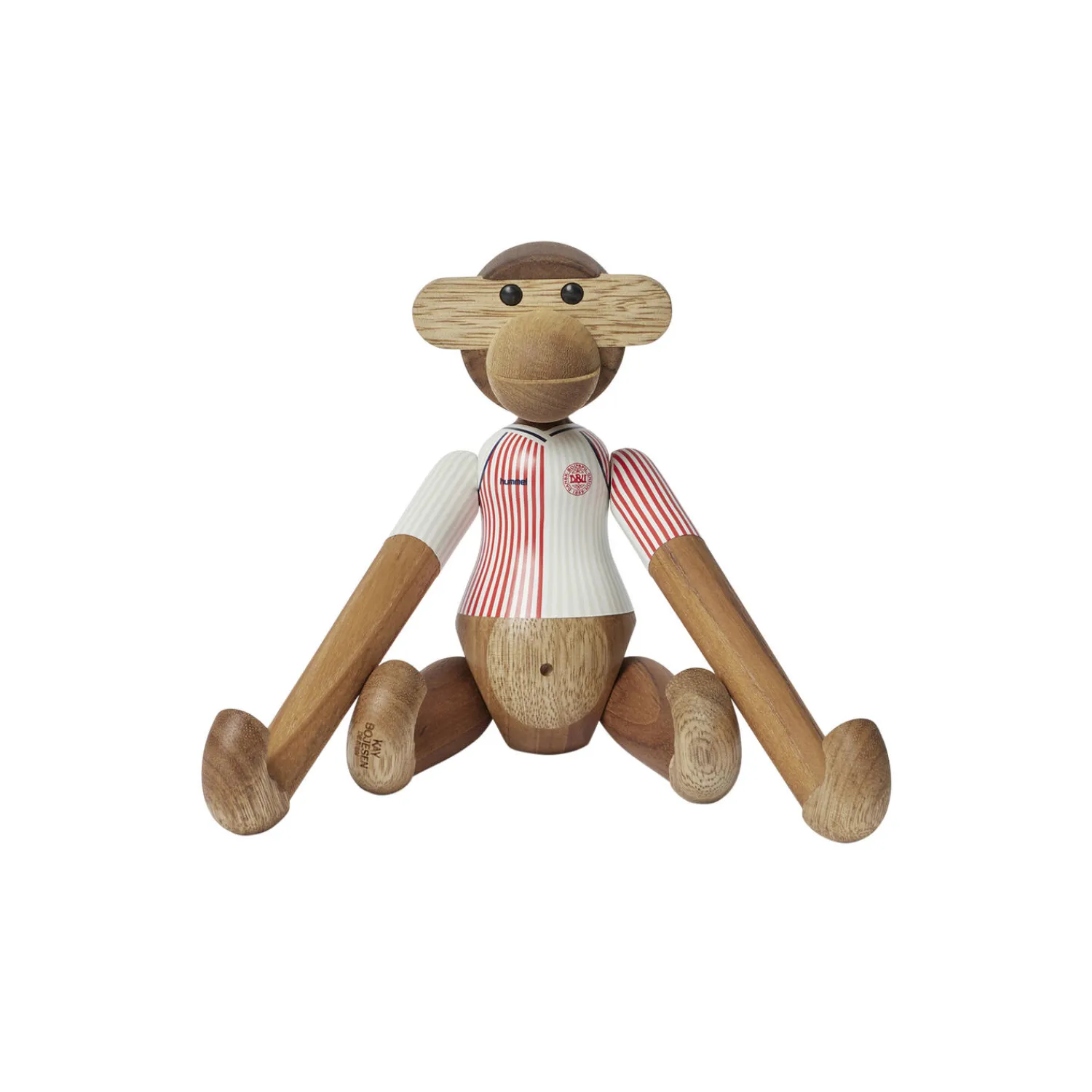 Ny holdkammerat til alle i rødt og hvidt. Med Kay Bojesen Abe x DBU er to af de største danske nationalikoner gået sammen for med humor, kreativitet og det gode håndværk at hylde sammenholdet og stoltheden over at stå sammen side om side fra leg til landshold. Og i 2025-udgaven af Kay Bojesen Abe x DBU tager vi sammen et nostalgisk skridt tilbage i tiden i en mindeværdig fejring af den ikoniske danske fodboldtrøje fra epoken omkring VM-slutrunden i Mexico i 1986. Du husker sikkert trøjen karakteriseret ved sit enkle og alligevel meget genkendelige todelte design med tætte striber i to forskellige kontraster, hvor den ene side næsten virker fuldfarvet med striber i samme farvenuance, mens den anden side har en mangfoldighed af tynde røde og hvide striber. Lige præcis den retrotrøje der altid vil fremkalde uforglemmelige minder om Herrelandsholdets gennembrud på den internationale scene. Et værdsat symbol for både fodboldfans og designentusiaster. Trøjedesignet er skabt af hummel, og for mange danskere repræsenterer denne enestående fodboldtrøje ikke bare en hyldest til en svunden tid. 86-trøjen er også en forbindelse til den nationale identitet og stolthed, som mange oplevede, fordi VM i Mexico var en skelsættende turnering for Danmark, hvor Herrelandsholdet i den grad trådte ind med et varigt aftryk på fodboldens verdenskort. Derfor fungerer trøjen også som et symbol på fællesskab og national stolthed, der bringer mennesker sammen i deres kærlighed til sporten – og hinanden. Lige nøjagtig det som samarbejdet mellem Kay Bojesen og DBU handler om, nemlig vigtigheden af at bevare og fejre dansk kultur og historie, samtidig med at fans – både fodboldfans og designfans – får mulighed for at få del i et eksklusivt stykke af denne arv ved at lade et måske endnu mere verdensberømt ikon inden for dansk design bære den med stolthed. Kay Bojesen Abe x DBU med denne fuldstændig legendariske landsholdstrøje produceres kun i 2025. Og når nu det er selveste Kay Bojesen Aben, der tager den på, så gør det jo heller ikke noget, at 86-trøjen i fodboldkredse fortsat anerkendes som en af de flotteste fodboldtrøjer nogensinde og har vundet flere internationale priser som en af fodboldhistoriens mest ikoniske trøjedesigns. Du kan få Kay Bojesen Abe x DBU i 2025-versionen i to størrelser. Du bestemmer selv, om det skal være denne lille udgave på 18,5 cm i højden eller den lidt mindre fodboldfan på 9,5 cm, som du inviterer indenfor – eller måske dem begge. Såvel lille som mini de er iklædt Herrelandsholdets flotte 86-udebanetrøjer malet med stor omhyggelighed og påført med print med største præcision ned til de mindste detaljer, så trøjedesignet står så tæt som muligt på originalen og smukt fortolket i tråd med figurhistorien med det autentiske og gennemarbejdede udtryk fuld af den sjæl og humor, der altid har været udgangspunktet for Kay Bojesens unikke håndværk og historiefortælling. Begge størrelser kommer i det klassiske mix af FSC®-certificeret teak og kontrolleret limbatræ. Med det fortsatte samarbejde med DBU videreføres Kay Bojesens originale fortællinger i træ med et nyt kapitel om fodbold og fællesskab, der ydmygt og med et glimt i øjet skriver videre på en legendarisk og spillevende designarv.