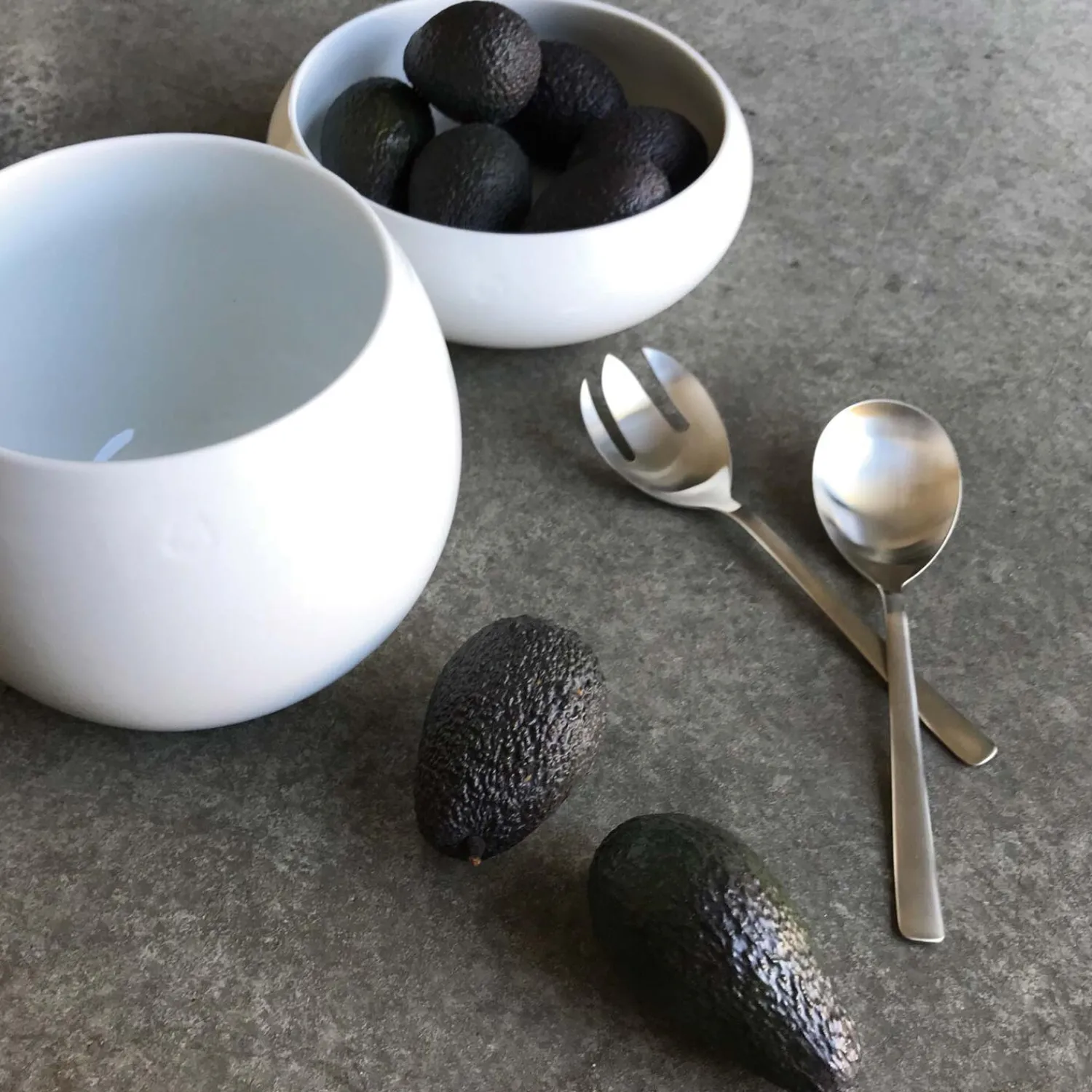 Serveringsske og ditto gaffel sikrer et fast greb om grønt og salater. Og så er de gode til at fiske ting op af kogende vand på komfuret. Salatsættet i mat stål består af en lille salatske (18,5 cm) og en lille salatgaffel (18,5 cm). Begge bestikdelene er designet af Kay Bojesen, og er en del af bestikserien Grand Prix.
