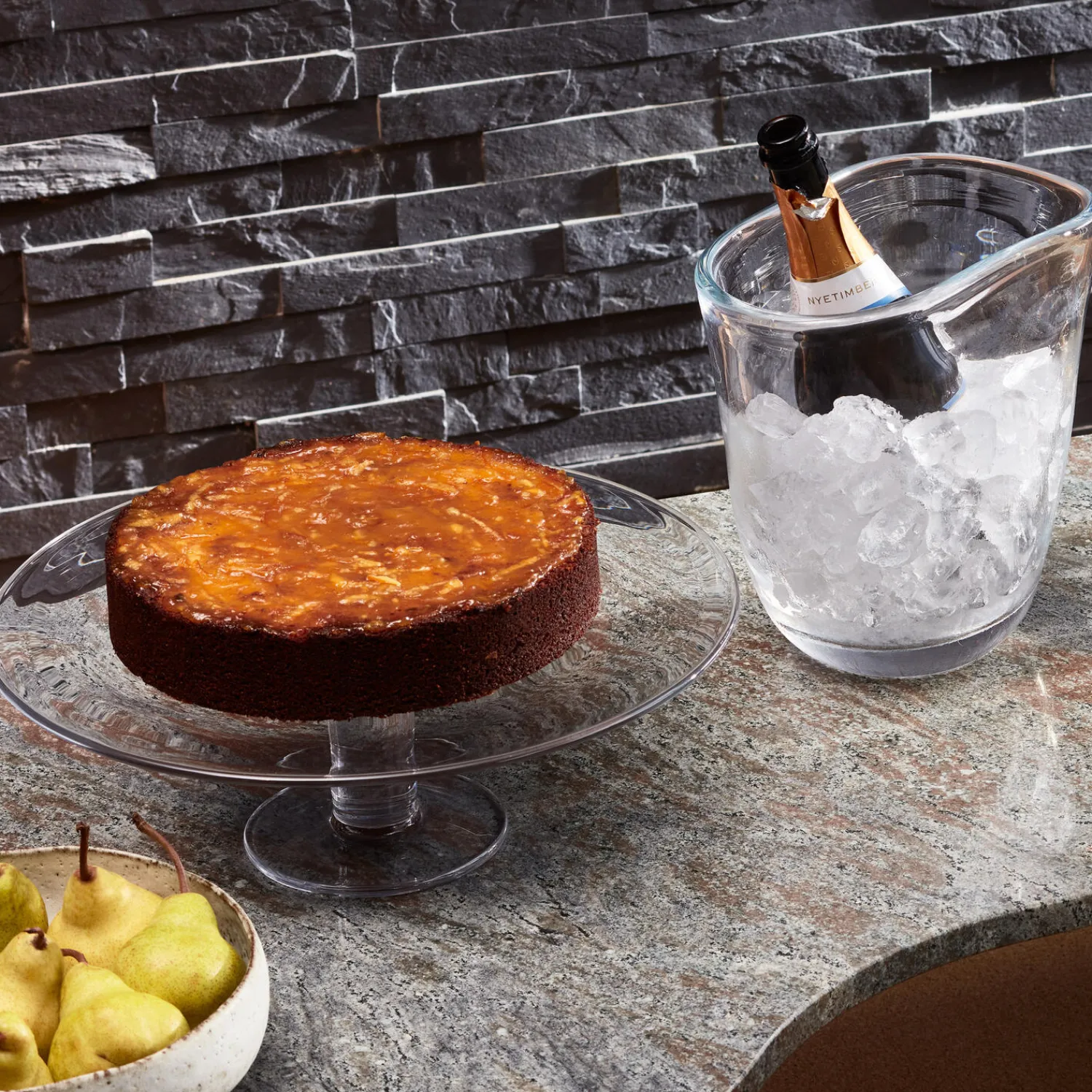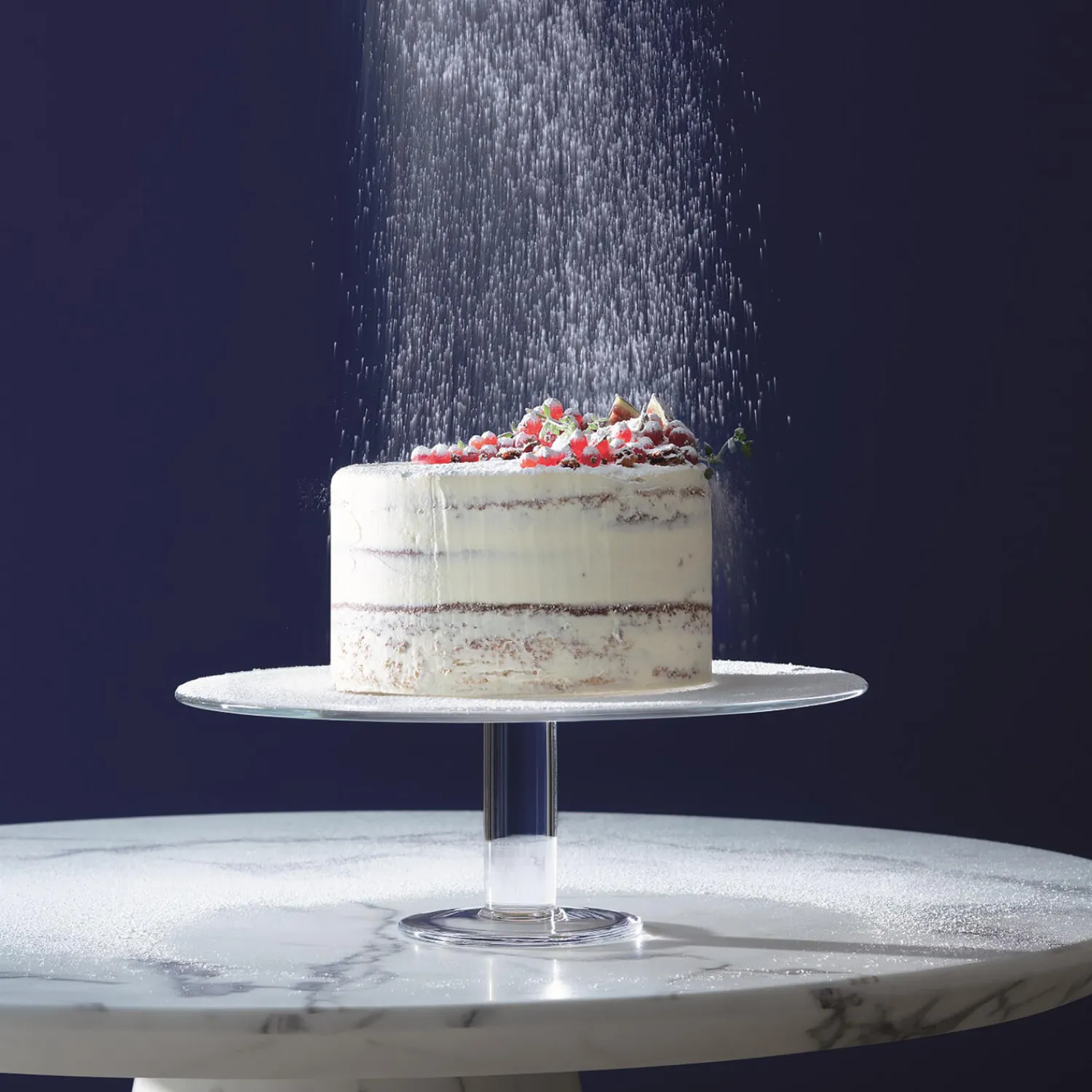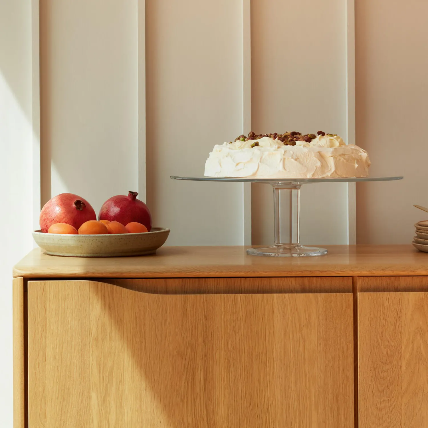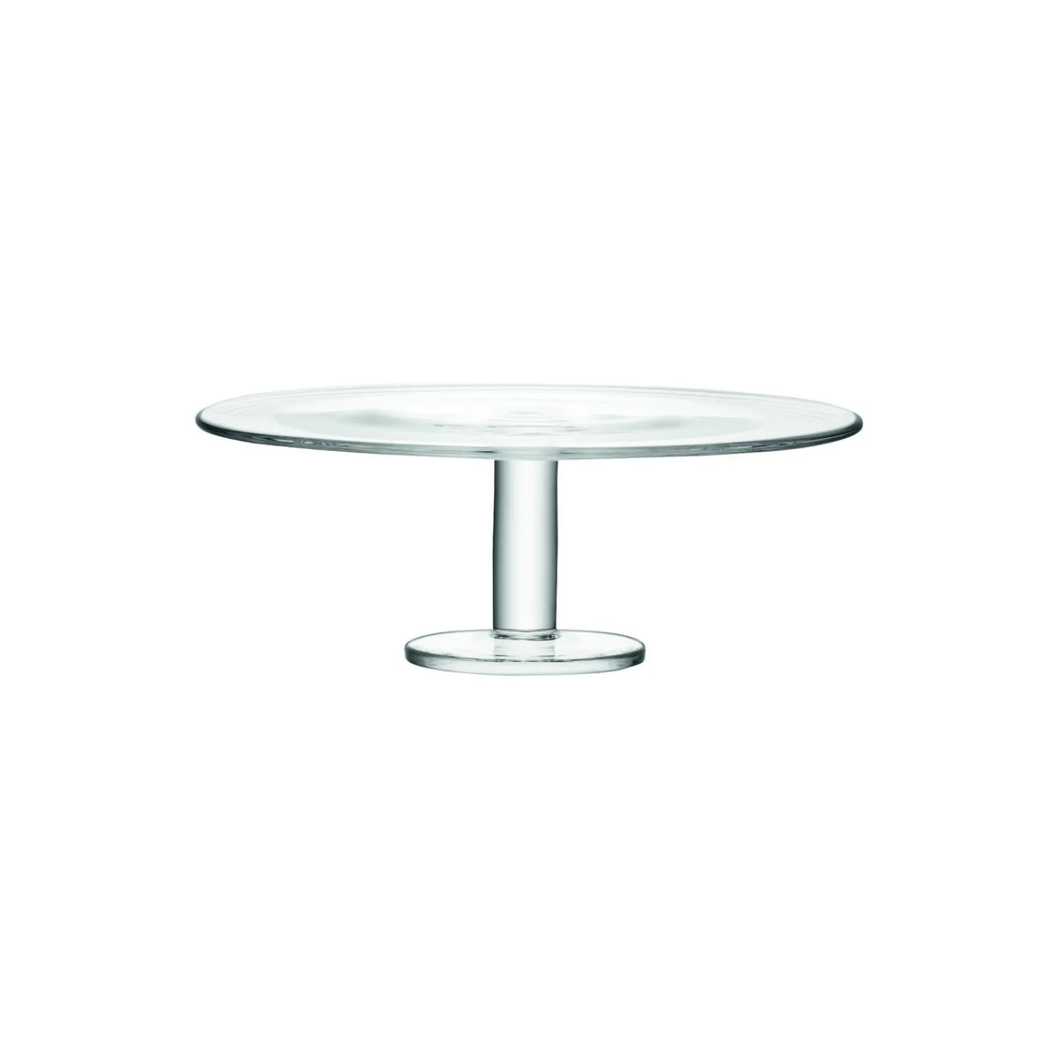 En høj, tyk stilk og skiveformet fod løfter denne store kagestand i glas. Et servicecenter til ekstravagante kager, store tærter og bunker af kæmpe marengs. Mundblæst af mesterglaspustere.