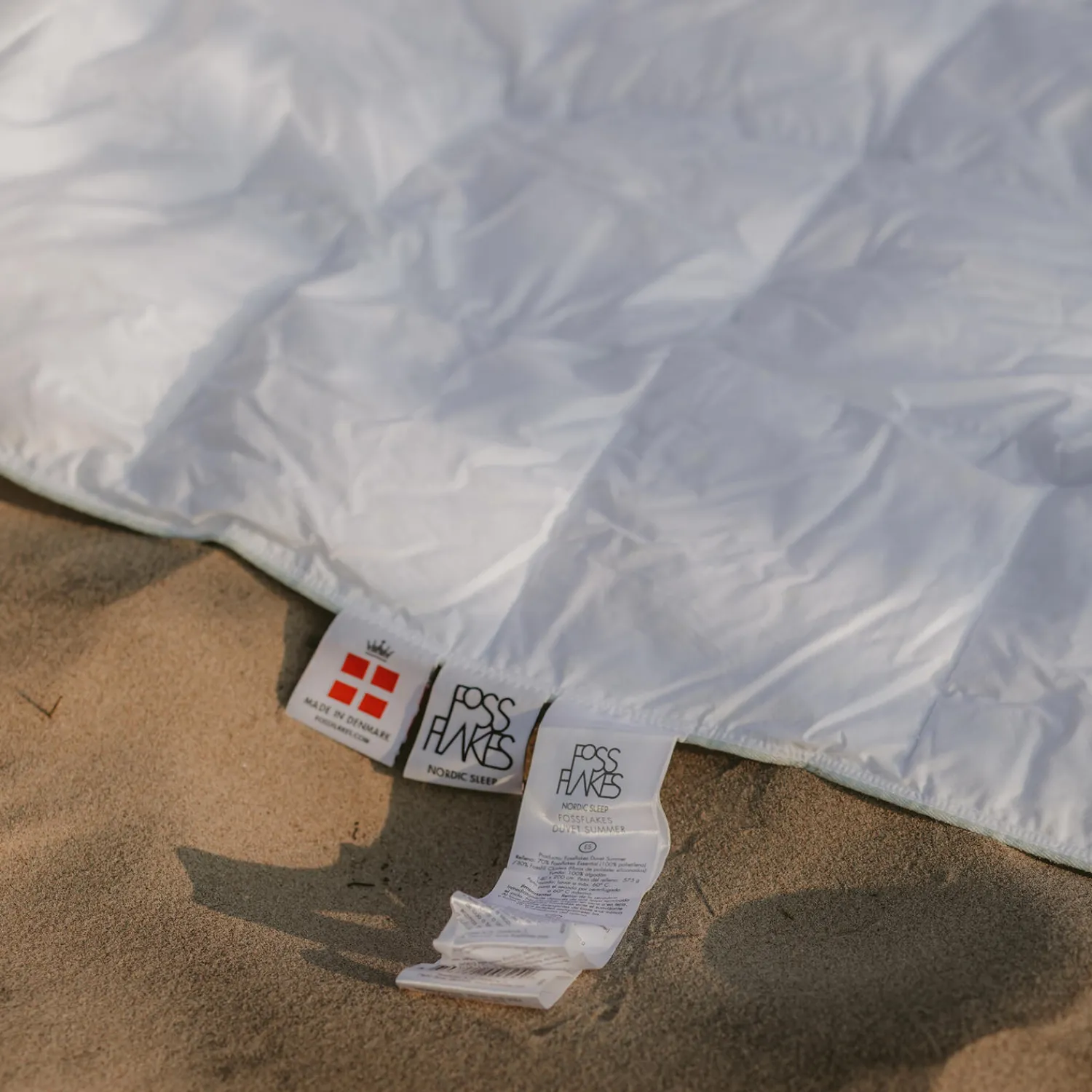 En fyldigere sommerdyne, der holder dig kølig. Fossflakes sommerdynen er en allergivenlig fiberdyne, der minder mere om en dundyne. Fyldet er nemlig et løst materiale som dun er, en unik blanding af de fine små Fossflakes og ultralette polyesterkuglefibre. Luftindholdet heri lader fugt og varme fordampe og det gør dynen åndbar. Dynen er desuden syet med små, gennemstukne kassetter, der skaber såkaldte ‘kuldebroer’, som sammen med det åndbare fyld sikrer dig en kølig nattesøvn. Fyldet fordeler sig jævnt, kan altid rystes op og danner ikke klumper efter brug og vask. Både fyld og vår er certificeret efter strengeste Oeko-Tex Standard 100 Class 1. Dynevåret er syet i 100% bomuld.Fossflakes dyner er nemme at vedligeholde og bevarer sin fylde, selv efter hyppig vask. Maskinvaskes ved 60° C og holdes derved fri for støvmider. Brug enzymfrit vaskemiddel og undgå brug af skyllemiddel. Kan tørretumbles på uld eller silkeprogram. Tåler ikke høj varme. Er du i tvivl om din maskine kan overholde varmegraderne, så lad i stedet dit Fossflakes produkt lufttørre. Fossflakes er designet og produceret i Danmark.
