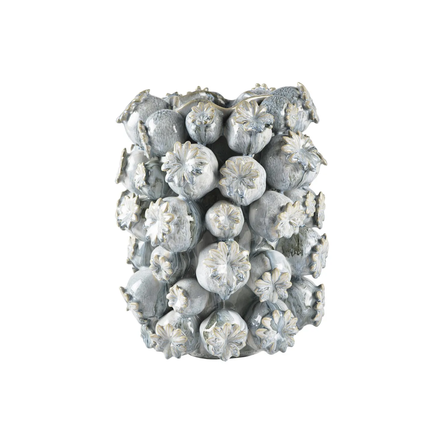 Virkelig flot og skulpturel stentøjsvase, der både er imponerende med en stor buket blomster og som en dekoration i sig selv. Vasen er dækket med smukke figurer formet som valmuefrøstande, disse er formet og sat på i hånden.