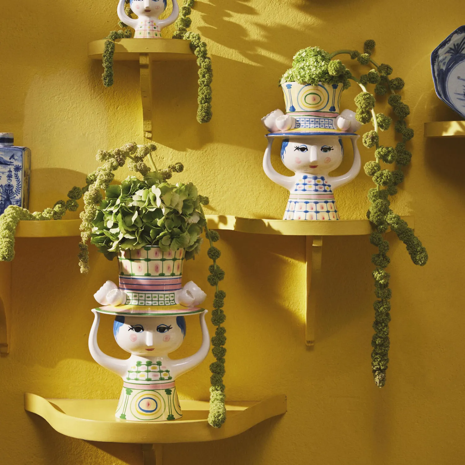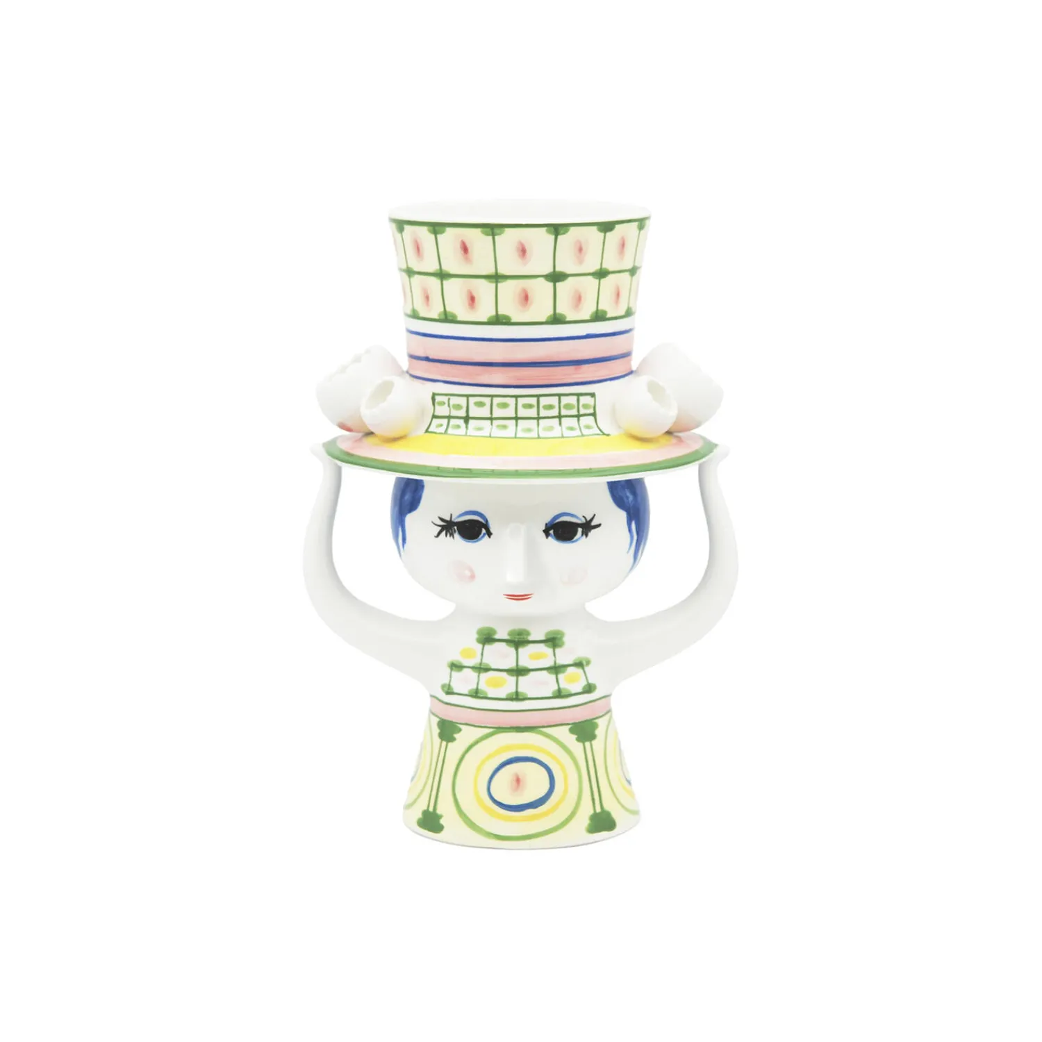 Invitér den nye hattefrøken indenfor, og lad hende skabe glæde i boligen med sine fine farver, finurlige detaljer og håndmalede dekorationer. Bjørn Wiinblad havde en forkærlighed for figurer med hatte, og arkiverne rummer utallige eksempler på, hvordan hatten dukker op igen og igen på nye, kreative og legende måder. Han designede selvfølgelig ikke små, fine pyntehatte. Nej, det var store voluminøse kreationer, der var både skulpturelle og avantgarde i deres udtryk – præcis som i serien Lady with hat. Vasen i blankglaseret keramik på 24,5 cm er præget af den grønne farve, og skørtets geometriske cirkler står i skøn kontrast til hattens tern. Som et lille tårn vokser hatten op mod himlen, mens den fine frøken balancerer den med sine hænder. Det giver vasen et finurligt og fantasifuldt udtryk perfekt til blomsterbuketten i den legende boligindretning. En anden detalje, der er gennemgående i serien, er de små, figurative blomster, der er placeret langs skyggen på hattene. Endnu en dekorativ detalje inspireret af Bjørn Wiinblads originale former og farver. Præcis som Bjørn Wiinblad repræsenterer Lady with hat alt, hvad der er skørt, skævt, kreativt og vidunderligt.