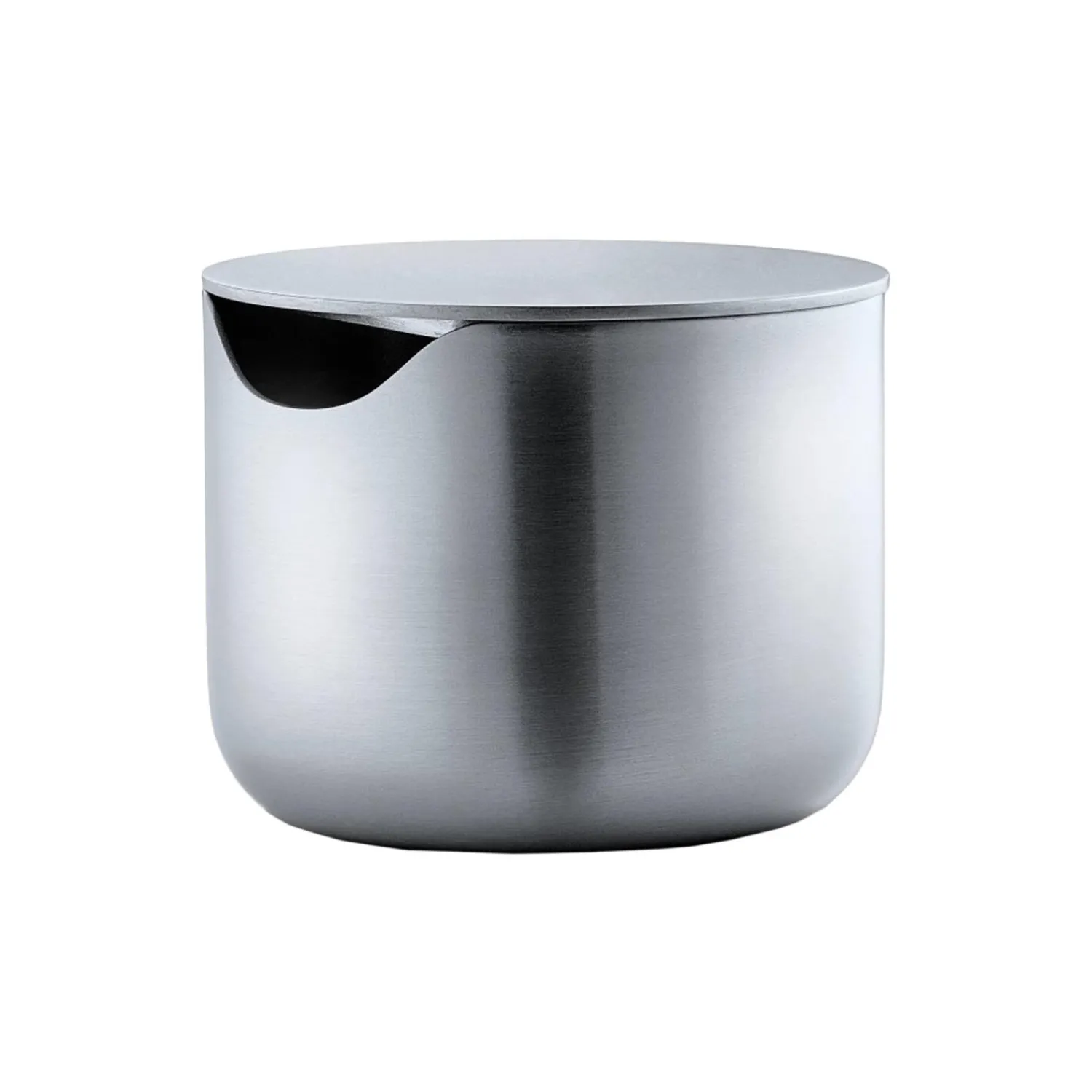 Med sin diskrete, men tiltalende afrundede form er BASIC-sukkerskålen med låg en konvergens mellem design og funktionalitet. Den er fremstillet i mat rustfrit stål og passer perfekt til de øvrige produkter i BASIC-serien. Har en ekstra åbning til en ske. Tåler opvaskemaskine.