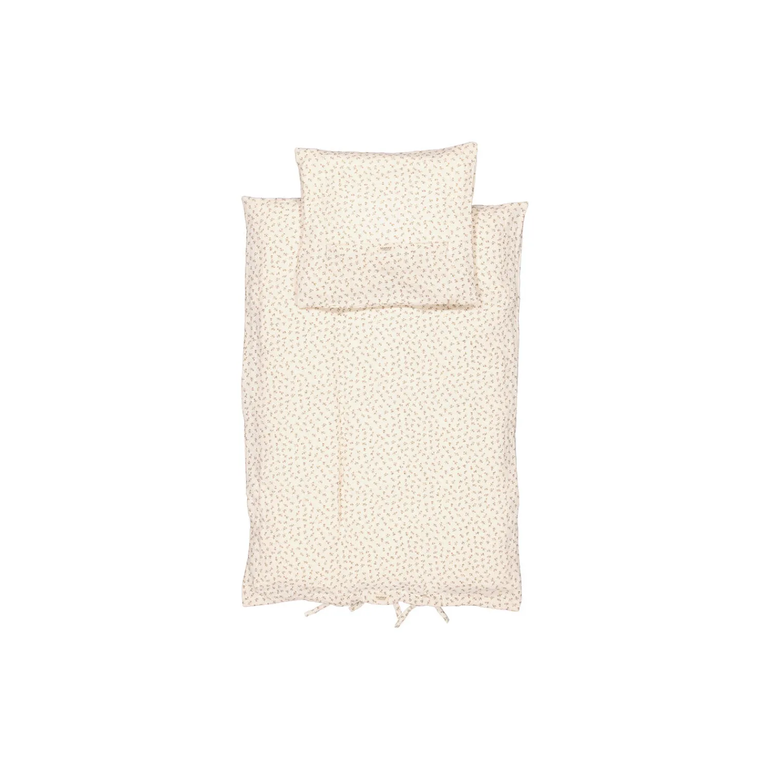 Sengetøj med betræk til dyne og hovedpude i bæk og bølge. Dynebetrækket lukkes med bindebånd i fodenden.