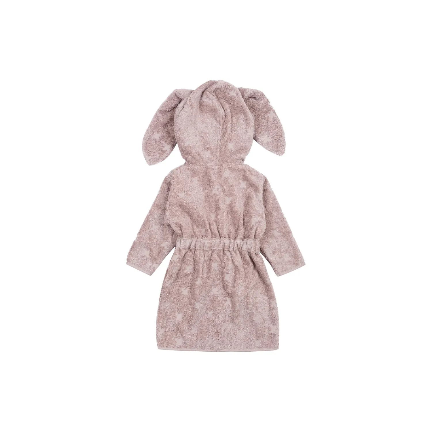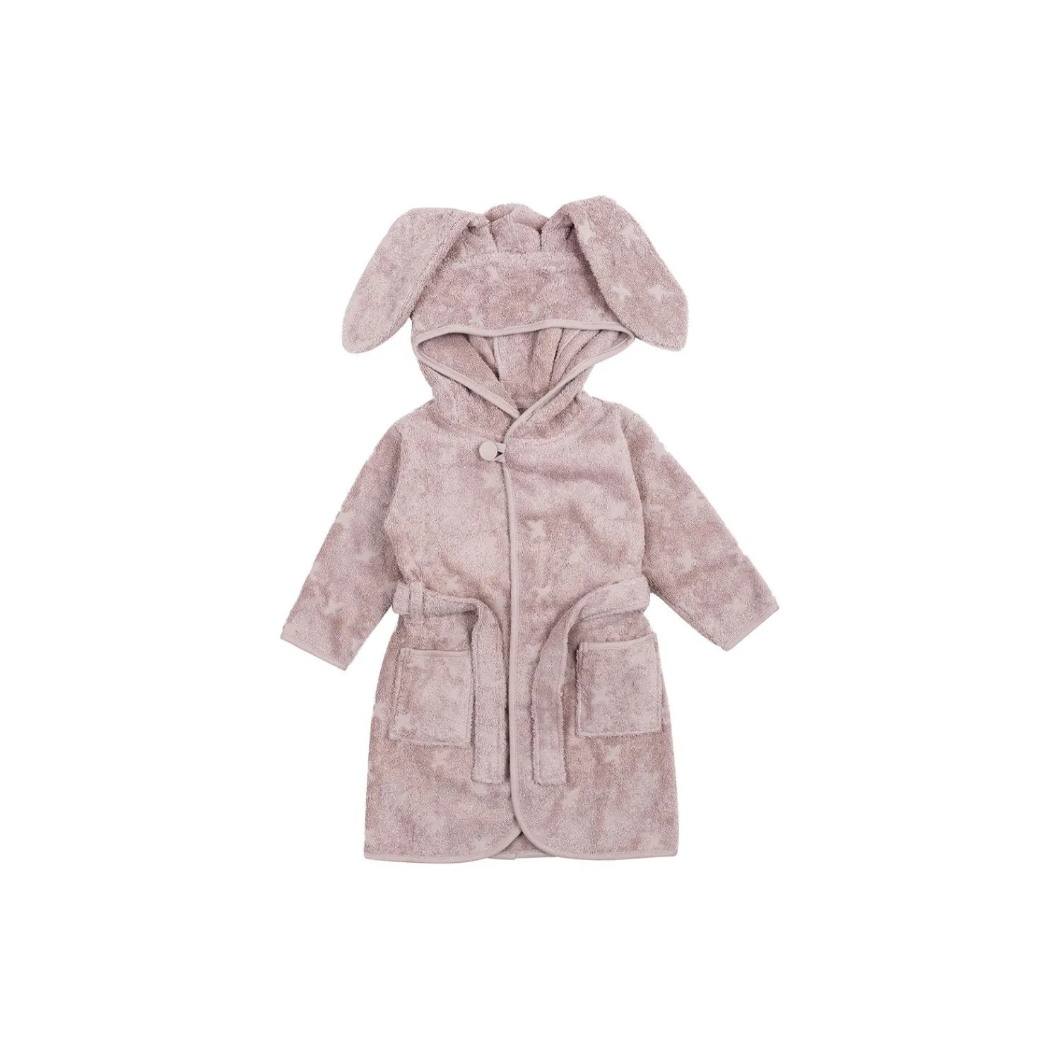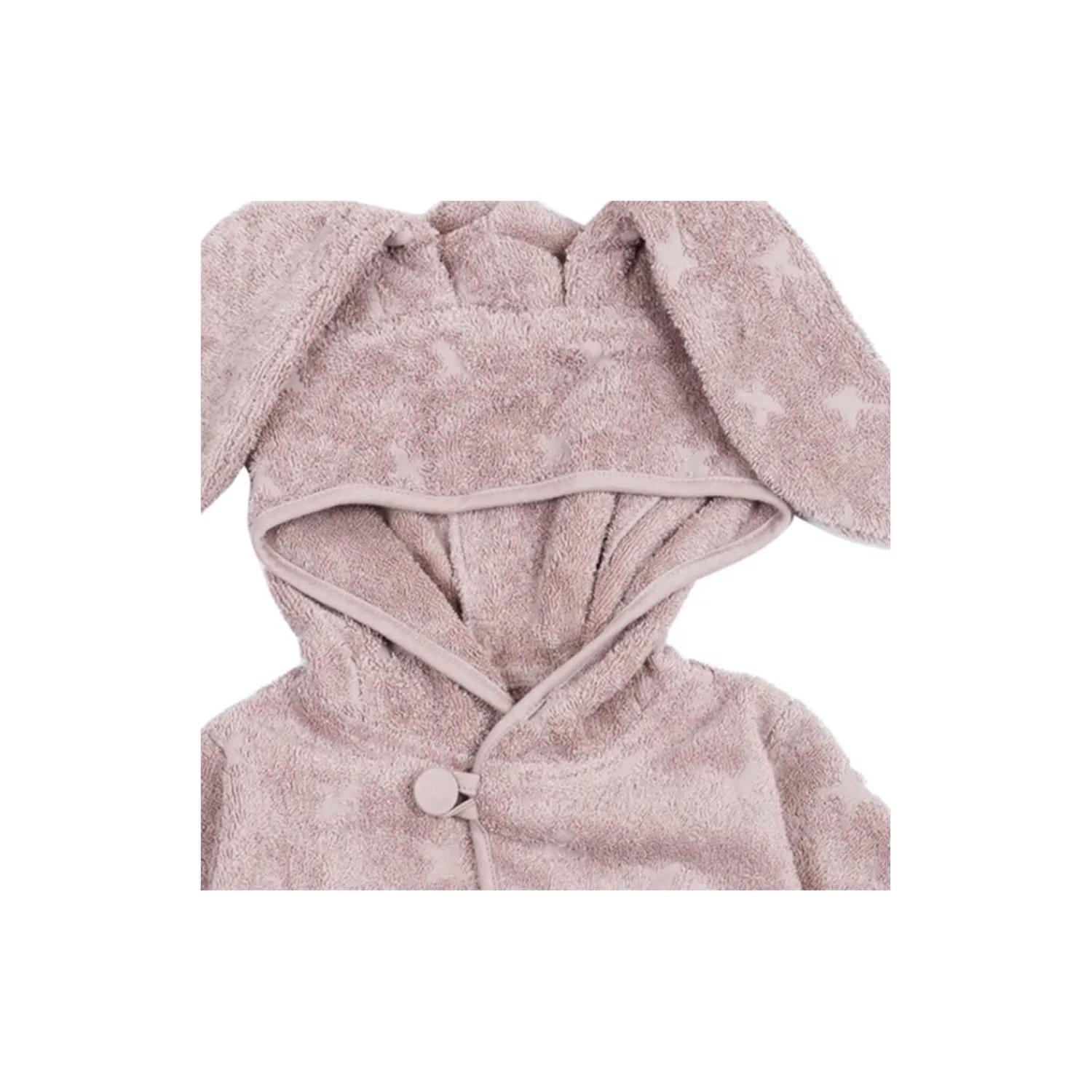 Super fin og blød badekåbe i den blødeste bomulds frotte. Praktisk bindebånd rundt om livet samt lommer fortil. Bindebåndet er påsyet bagpå så bæltet ikke falder af og bliver væk. Der er elastik i taljen så badekåben opnår en bedre pasform. Badekåben er udstyret med en dejlig stor hætte med lange kanin ører. Produktet er GOTS organic- certificeret, hvilket betyder at bomulden er certificeret økologisk, og at der i alle andre processer som farvning, strikning og syning er taget de strengeste hensyn til miljøet. GOTS er internationalt anerkendt som den førende standard for forarbejdning af tekstiler af økologisk bomuld. Derudover tages der også hensyn til arbejdsforholdene, hos dem der producerer tøjet. Økologisk bomuld 100%