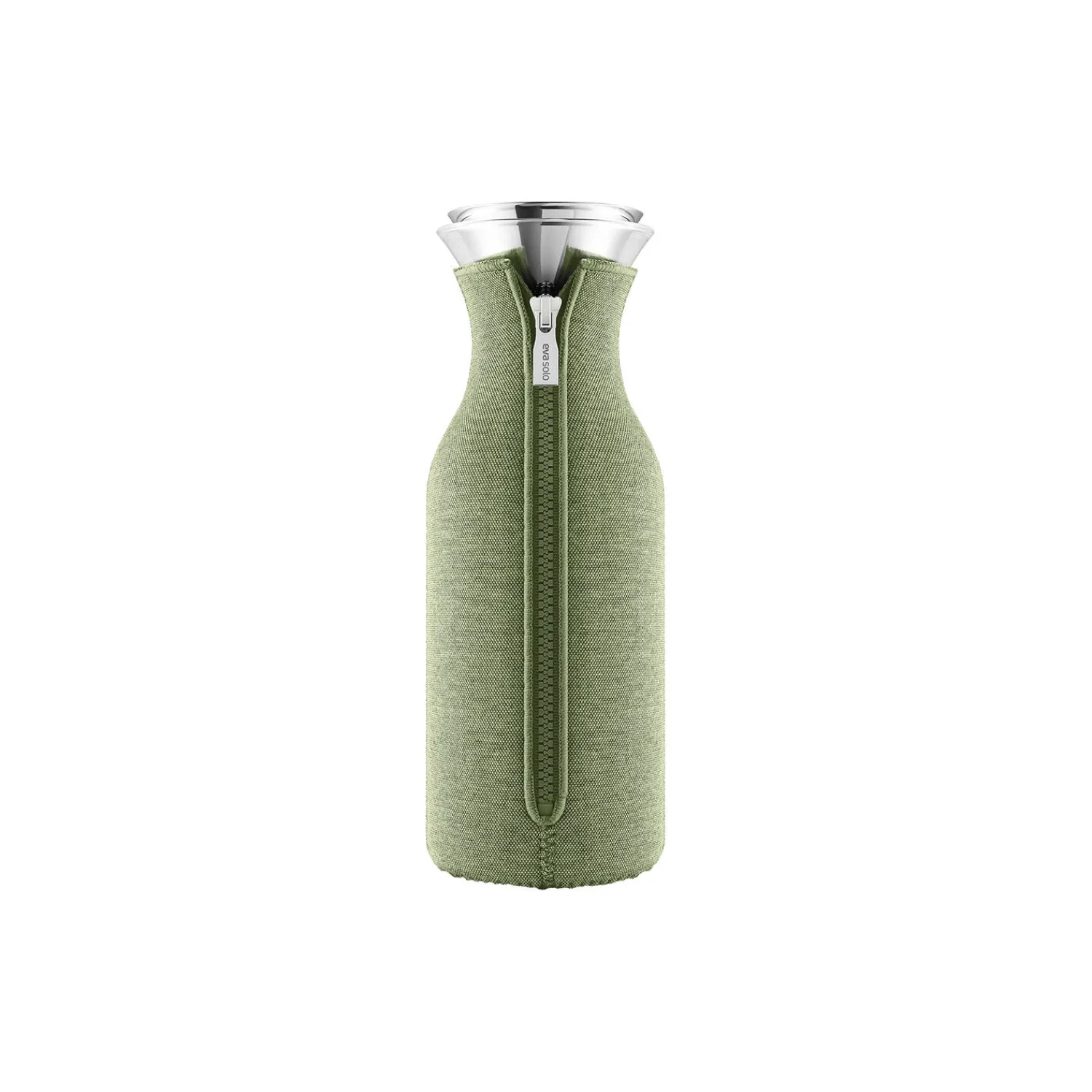 Karaflen passer i de fleste køleskabslåger og er velegnet til både kolde og varme drikke. Den 100% drypfri hældekrave i rustfrit stål sikrer, at indholdet ender i glasset og ikke på dugen. Vippelåget åbner automatisk, når du hælder, hvilket gør en-håndsbetjening mulig, og forbliver forseglet, når det ikke er i brug. Den karakteristiske dragt gør karaflen behagelig at betjene, hjælper med at bevare indholdets temperatur og absorberer kondensvand, så det ikke ender som pletter på køkkenbordet. Dragten er lavet af neopren med en yderside af vævet tekstil. Glas- og metaldele tåler maskinopvask. Dragten kan maskinvaskes ved 30 grader.