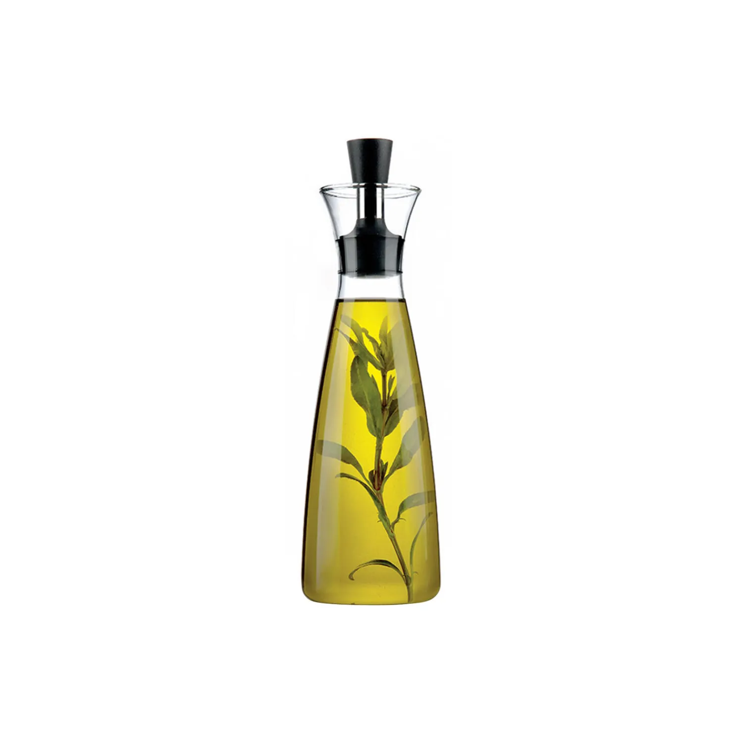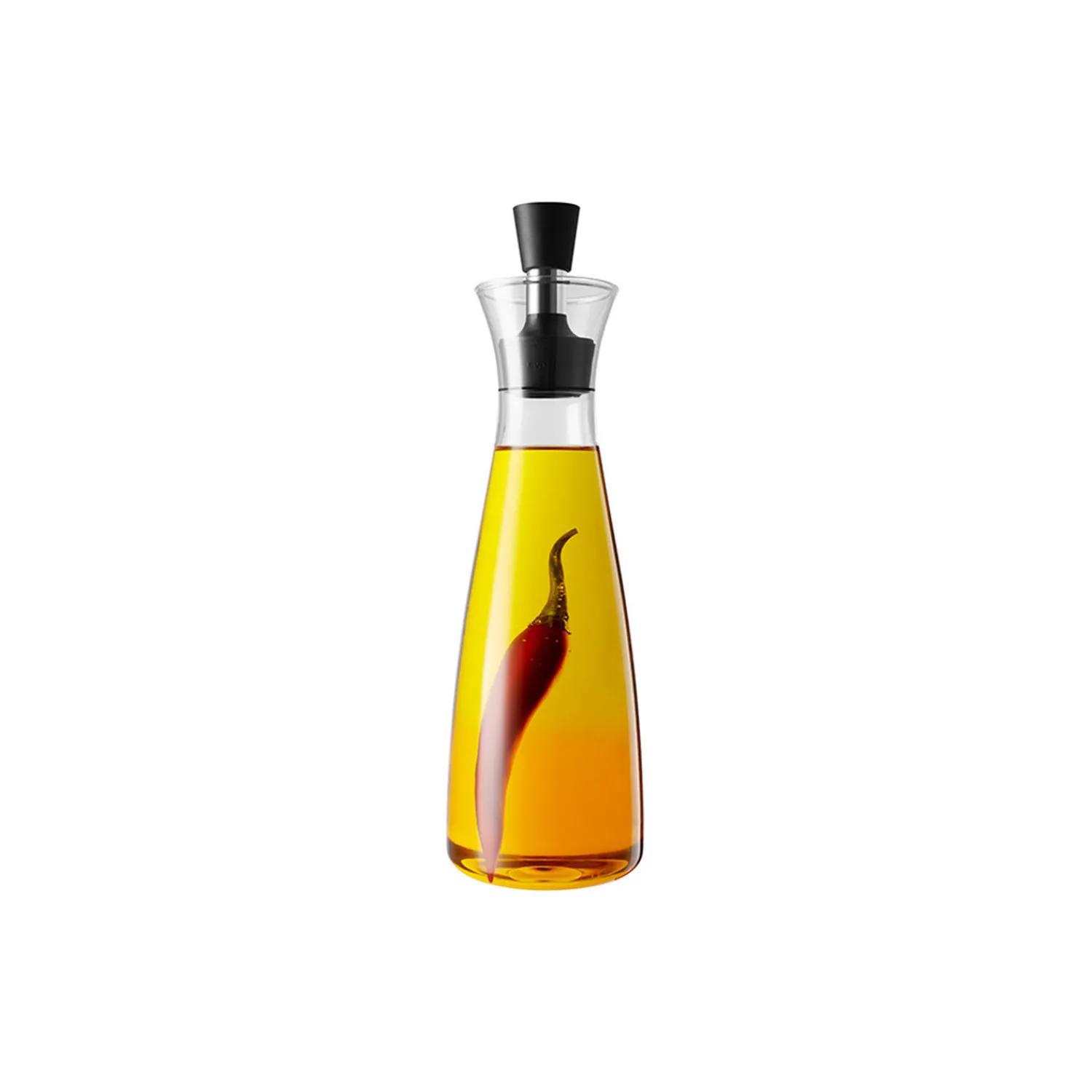 Ét produkt med mange muligheder og funktioner. Hæld din olie over i karaflen, opbevar den i køleskabet eller i køkkenskabet så den er klar, når du skal bruge den. Derudover kan den tages direkte med ind på bordet til servering, hvis der skal bruges olie til salaten. Den drypfrie hældetud hælder præcist og der kommer ingen pletter på bordet eller dugen. Den tætsluttende prop bevarer aroma og smag, og smage fra køleskabets andre madvarer undgås. Karaflen er lavet af borosilikatglas, som tåler både kolde og varme væsker, og karaflen tåler derfor mikrobølgeovn (hældetuden skal dog ikke være på i mikroovnen). Indeholder 0,5 liter. Alle dele tåler maskinopvask og er derfor nem at rengøre.