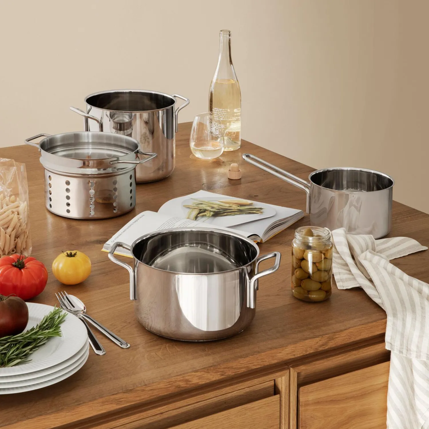 Meget anvendeligt grydesæt, med dele du ender med at bruge hver dag. Den vellykkede sammensmeltning mellem form og funktion, har gjort den rustfrie serie af kogegrej fra Eva Trio til moderne designklassikere. Gryder fremstillet i rustfrit stål er robuste og tåler høj varme. Stål er desuden modstandsdygtigt over for madsyre, og er et godt valg til det daglige brug af gryder. Sættet indeholder: Kasserolle 1,1 L, Gryde 2,2 L, Gryde 3,6 L, Pastaindsats