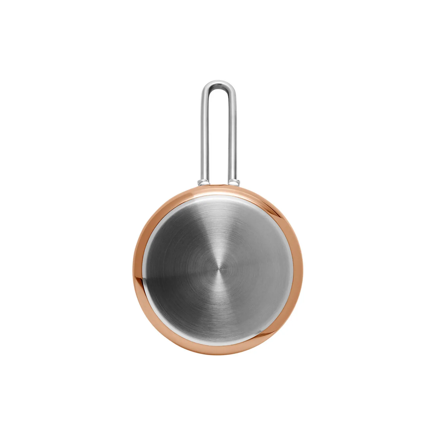 Kobberkasserollen er ikke kun en smuk tilføjelse til ethvert køkken eller spisebord, men tilbyder også overlegen ydeevne. Ved at kombinere de bedste egenskaber fra kobber, aluminium og rustfrit stål, sikres der fremragende varmefordeling og varmeledningsevne. Kobberets enestående evne til hurtigt at reagere på temperaturændringer gør kasserollen ideel til opgaver, der kræver præcis varmestyring, såsom tilberedning af saucer eller smeltning af chokolade. Indersiden i rustfrit stål er både hygiejnisk, slidstærk og let at rengøre. Fungerer på alle varmekilder.