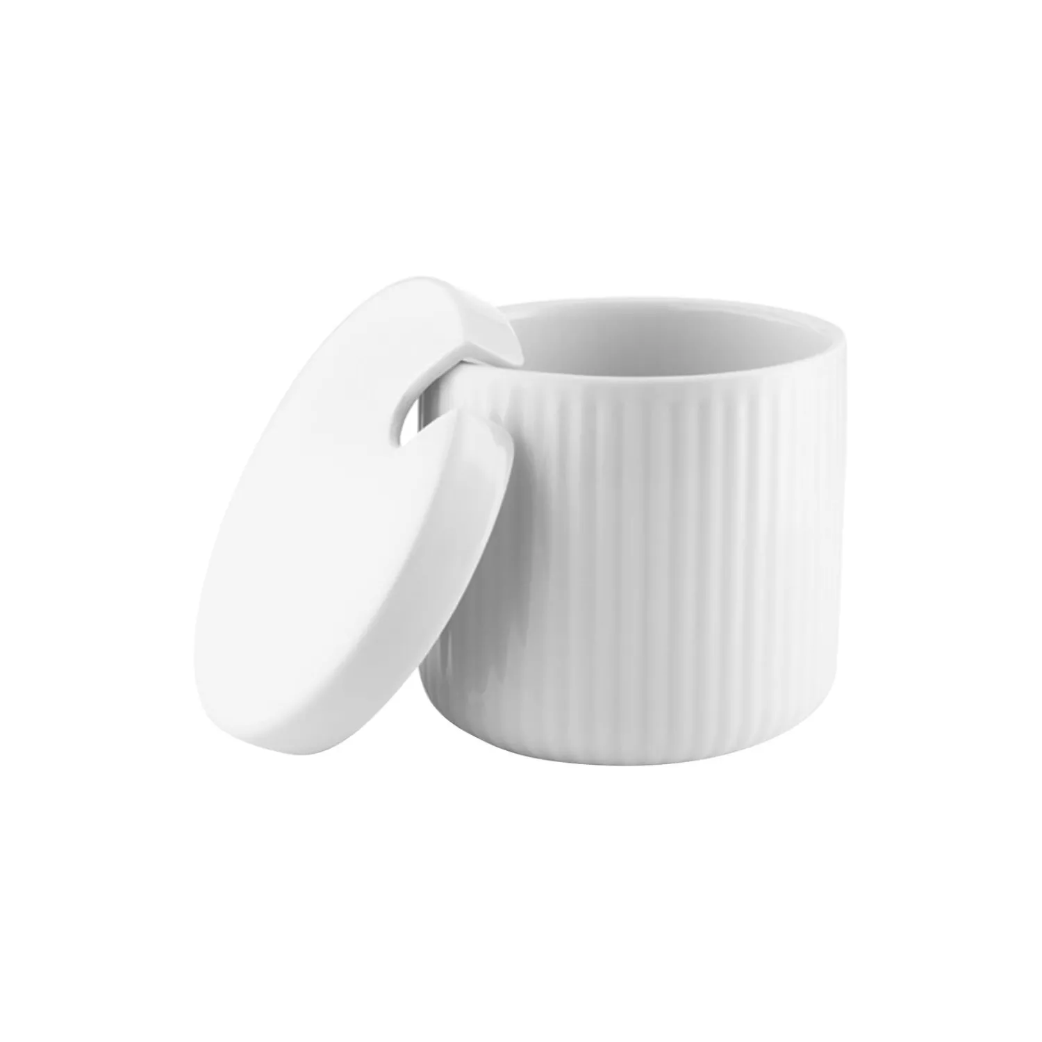 Eva Trio Legio Nova er en ny fortolkning af det klassiske Eva Trio Legio stel, designet af Ole Palsby. Med sin rillede, delikate dekoration står Legio Nova smukt alene, men kan også med fordel matches med Legio stellets tidløse enkelthed. Krukken med låg har mange anvendelsesmuligheder. Den kan f.eks. bruges til krydderier, nødder eller marmelade. Indhakket i låget gør, at der er plads til teskeen, så den altid er lige ved hånden. Legio Nova har 10 års porcelænsgaranti og tåler både ovn, mikroovn, fryser og maskinopvask.