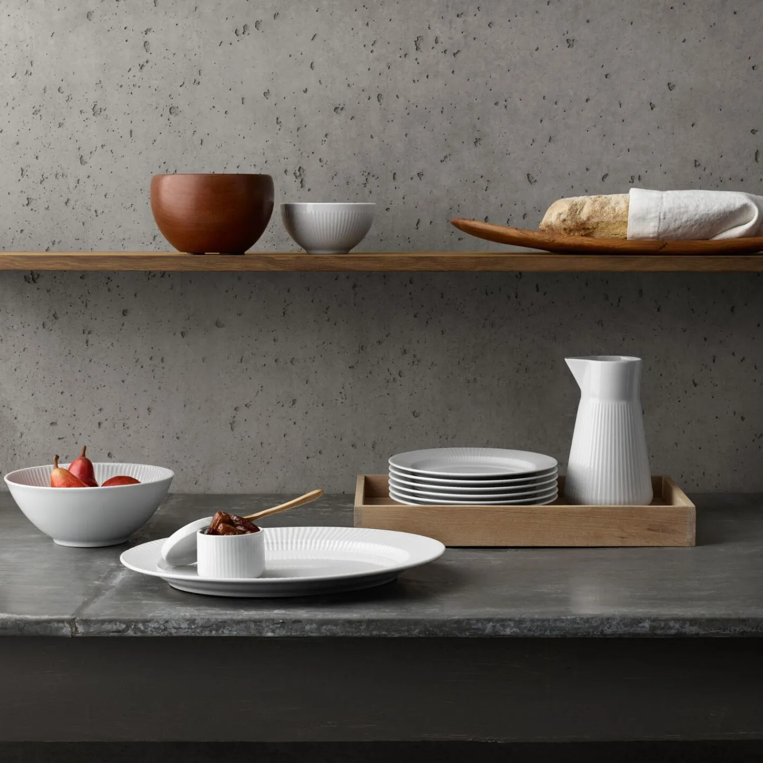 Hvor Legio’s formsprog er absolut minimalistisk, er Legio Nova designet med riller, der raffineret danner rammen om maden. Eva Trio er sponsor af det danske kokkelandshold, og i designprocessen er der fundet inspiration i at se deres madkunst, og den omhu de lægger i deres håndværk. Derfor indrammes tallerkenens midte af elegante riller der fremhæver anretningen. Legio Nova er ligesom Legio porcelæn af høj kvalitet, der både tåler ovn, mikroovn og fryser. Der er 10 års porcelænsgaranti på stellet, og så er det ikke mindst testet af det danske kokkelandshold, som anbefaler Legio Nova.