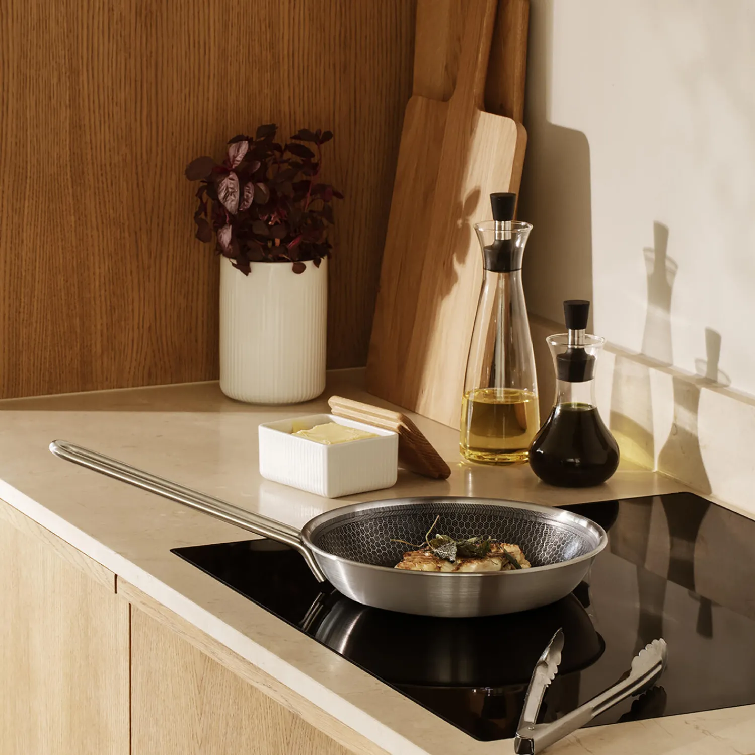 Uundværlig allround stegepande med banebrydende keramisk belægning, der gør panden hårdfør i særklasse. Pandens unikke mosaikmønster i overfladen består af rustfrit stål i toppen og keramisk Slip-let® belægning i bunden og tåler brug af metalredskaber. Belægningen gør det muligt at reducere mængden af fedtstof, giver den perfekte stegeskorpe og gør rengøringen nem. Stegepandens multi-layer- 3 lags teknologi sikrer optimal varmefordeling og en hård yderside modstår slid og brug. Størrelsen på de 24 cm er nem at håndtere, Brug panden til alt fra spejlæg til hakke- og plantebøffer. Panden tåler en tur i ovnen op til 400° C og er velegnet til alle varmekilder, også induktion. Tåler maskinopvask og rengøring med stålsvamp. Belægning er fri for fluorstoffer.