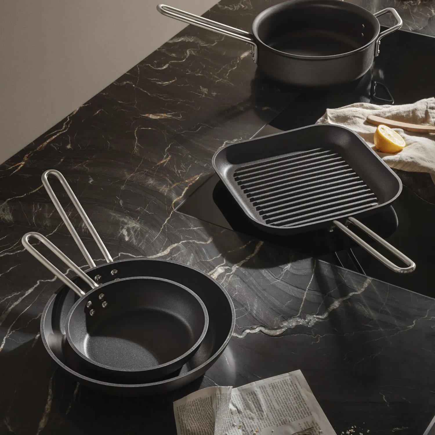 Det ultimative redskab til den ambitiøse kok. Perfekt til alt fra hård stegning ved høj varme til skånsom tilberedning af delikate råvarer. Den professionelle stegepandes korpus er fremstillet af 85 procent genanvendt aluminium og udstyret med en 10 mm bund, en 7 mm kant og et 10 mm wire greb. Den kraftige konstruktion sikrer maksimal holdbarhed og fremragende varmeregulering- og fordeling. Den keramiske Slip-Let belægning giver panden en fremragende slippeevne, der både letter madlavning og rengøring. Panden kan modstå temperaturer op til 400°C og fungerer på alle varmekilder, inklusive induktion. Vi tilbyder 5 års belægningsgaranti og 25 års garanti på, at panden holder formen og ikke bliver skæv i bunden. Tåler maskinopvask, men det anbefales at vaske panden i hånden for at bevare slippeevnen.