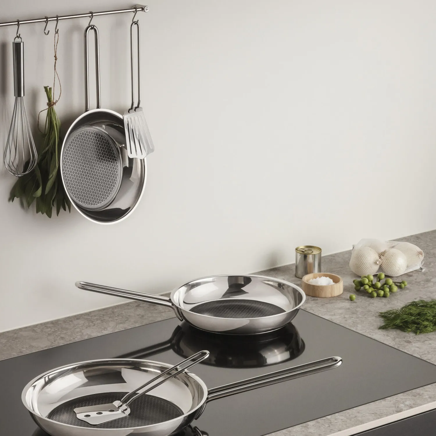 Alsidig kvalitetsstegepande hvor korpus er fremstillet af 90 procent genanvendt post-consumer rustfrit stål, et materiale der er yderst slidstærkt og nemt at holde rent og pænt. Panden er belagt med en keramisk Slip-Let® belægning udført i det revolutionerende mosaikmønster. Mønsteret i overfladen består af små forhøjninger af rustfrit stål, der beskytter den keramiske Slip-Let® belægning. Designet kombinerer holdbarheden fra rustfrit stål med de praktiske egenskaber fra Slip-Let®, hvilket resulterer i en pande, der besidder fremragende slippeevne, mens den tåler brug af metalredskaber, maskinopvask og temperaturer op til 400 °C. Stegepanden er velegnet til alle varmekilder. Kan bruges på følgende varmekilder: Glaskeramisk, Elektrisk, Gas, Induktion, Ovn.