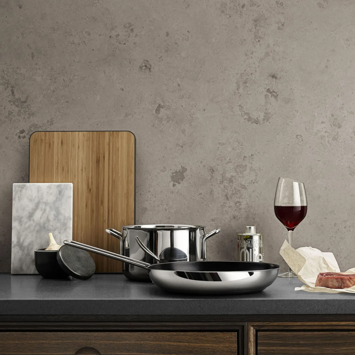 Pandens runde kanter gør det nemt at komme til med en paletkniv. Slip-Let®-belægningen forhindrer maden i at brænde fast, og der kan steges med meget lidt eller slet intet fedtstof. Kan anvendes på alle varmekilder, inkl. induktion.