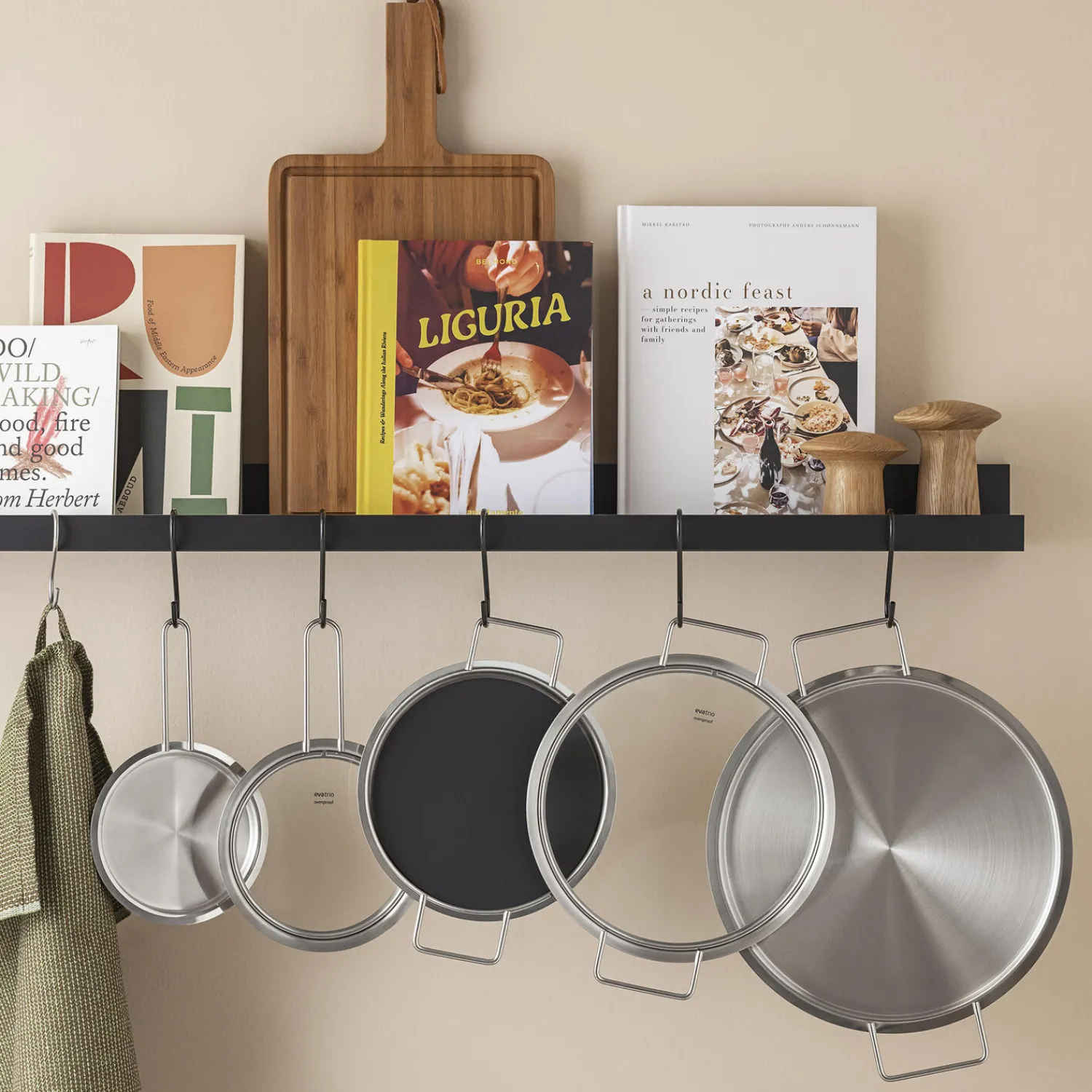 Tallerkenlåget kombinerer klassisk enkelhed med praktisk funktionalitet. Med dets lange håndtag kan du løfte låget og kigge til maden uden at skolde hænderne på opstigende damp. Låget kan stables eller hænges på en krog. Det flade design gør det muligt at placere tallerkener eller skåle på låget for at holde dem varme, mens du laver mad. Hoveddelen af låget er fremstillet af 90 procent genanvendt post-consumer stål. Alle gryder, pander og låg fra Eva Trio har faste størrelser, der kan stables og kombineres på tværs af modeller og materialer. Denne smarte løsning giver dig friheden til at vælge præcis det låg, du har brug for, samtidig med at det reducerer antallet af nødvendige låg. Eva Trio låg kan købes enkeltvis og tåler både ovn og opvaskemaskine.
