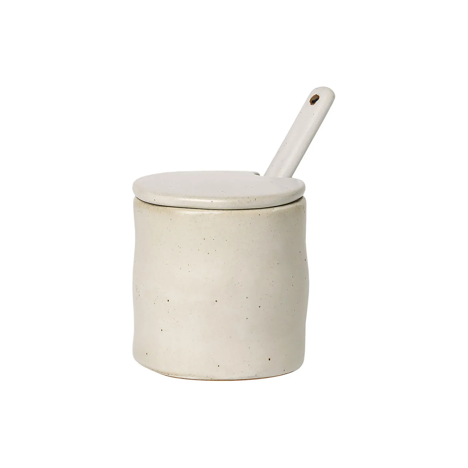 Flow krukke med ske i porcelæn med reaktiv glasur fra Ferm Living. Farve: off white. Dimensioner: H: 8 x B: 7,5 cm.