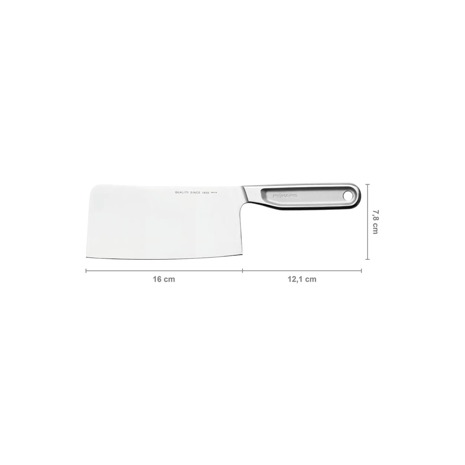Fiskars All Steel kinesisk kokkekniv er fremstillet af det reneste rustfri stål i høj kvalitet for førsteklasses skæreegenskaber og lang levetid. Den kinesiske kokkekniv har et kraftigt og robust blad, perfekt til hakning og udskæring af kød, fisk, hårde grøntsager, kød med ben og meget mere. Japansk stål med et højt kulstofindhold giver fremragende holdbarhed, og det helstøbte design giver kniven et flot tidløst look. Kniven er perfekt afbalanceret, så den ligger naturligt og komfortabelt i hånden, når du skærer. Det anbefales at vaske kniven i hånden. Designet i Finland.
