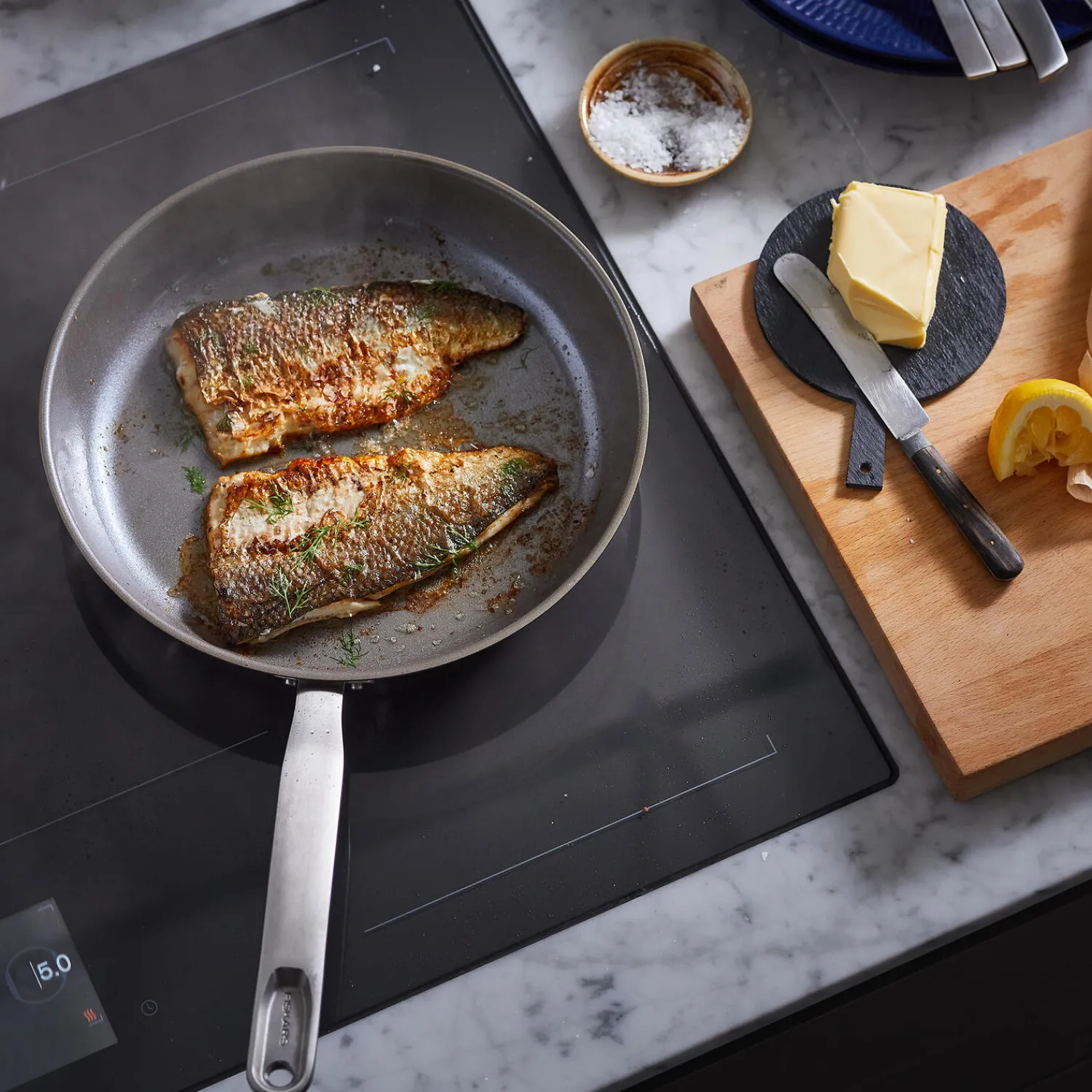 Fiskars All Steel stegepande 28 cm giver madlavningen et løft med genanvendt rustfrit stål i høj kvalitet, som minimerer affaldsmængden. Panden er fremstillet af 90 % genanvendt stål med 92 % lavere CO2-udledning end gennemsnittet i branchen. Takket være dens non-stick Ceratec™ belægning, der giver en fin stegeskorpe og kan bruges ved høje temperaturer, er du sikker på at opnå perfekte stegeresultater. Den tykke 3-lags bund er optimeret til effektiv og jævn varmefordeling på alle typer kogezoner. Pandens tidløse, simple udtryk passer godt ind i det moderne, bæredygtige køkken og gør hvert måltid til en god oplevelse. Fremstillet i Finland med bæredygtige processer og produktionsmetoder.