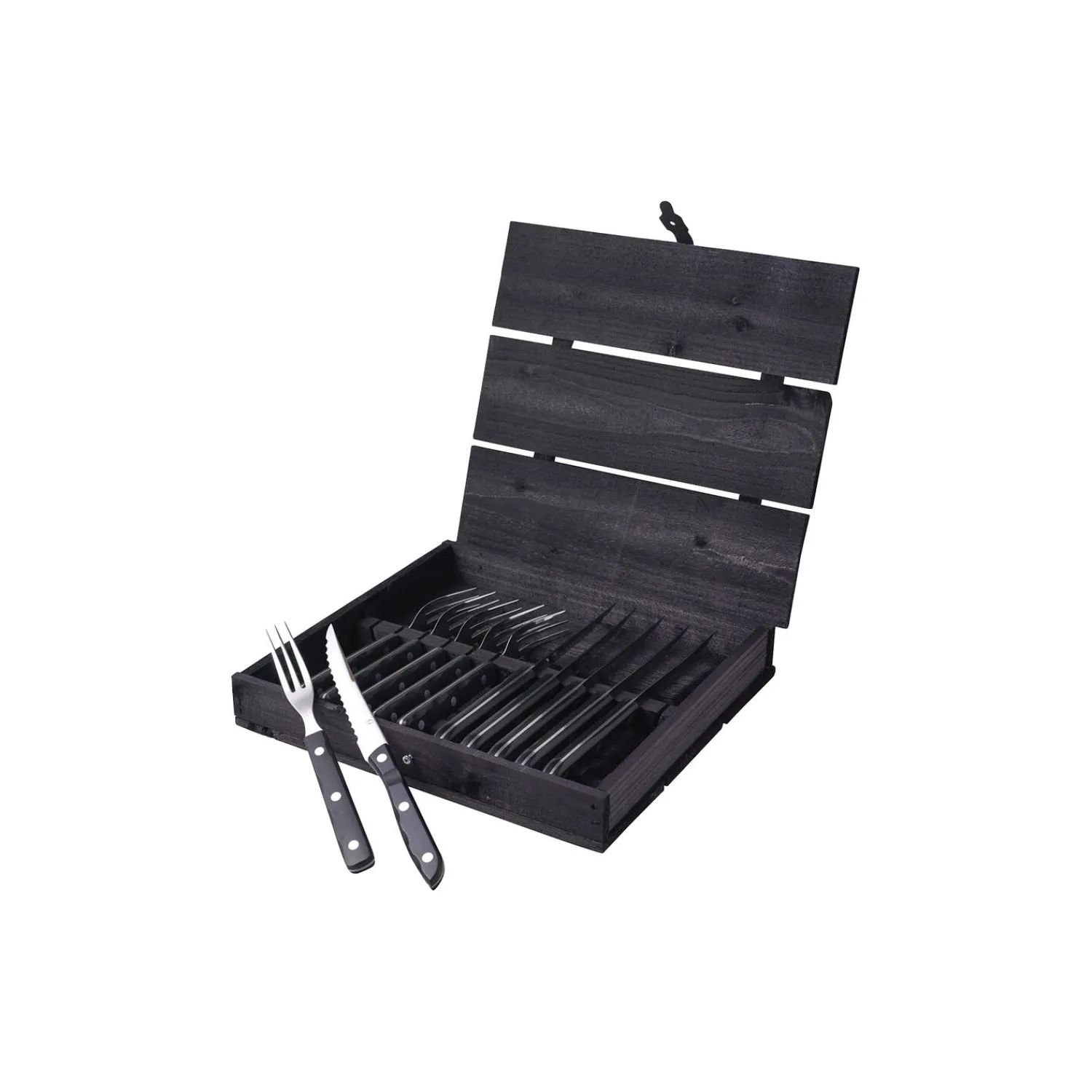 Old Farmer Black er et meget robust og smukt grillbestik, der er perfekt til den lækre steak og andet grillkød såvel som den friske sommersalat. Old Farmer Black kommer i en rustik trækasse, der gør bestiksættet til en fremragende og smuk gave. Fremstillet af matpoleret rustfrit stål med skaft i POM-plast i høj kvalitet.