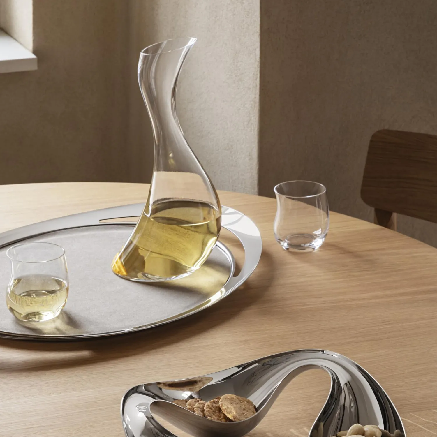 Den formfuldendte Cobra bakke indbyder til elegant servering af kaffe og drinks eller morgenmad på sengen. De bløde linjer i blankt rustfrit stål danner et skulputurelt udtryk og skaber en smuk kontrast til bakkens overflade, som er beklædt med gråt imiteret læder. Overfladen er slidstærk og skridsikker for at beskytte bakken mod ridser og minimere risikoen for spild, når du serverer drikkevarer.
