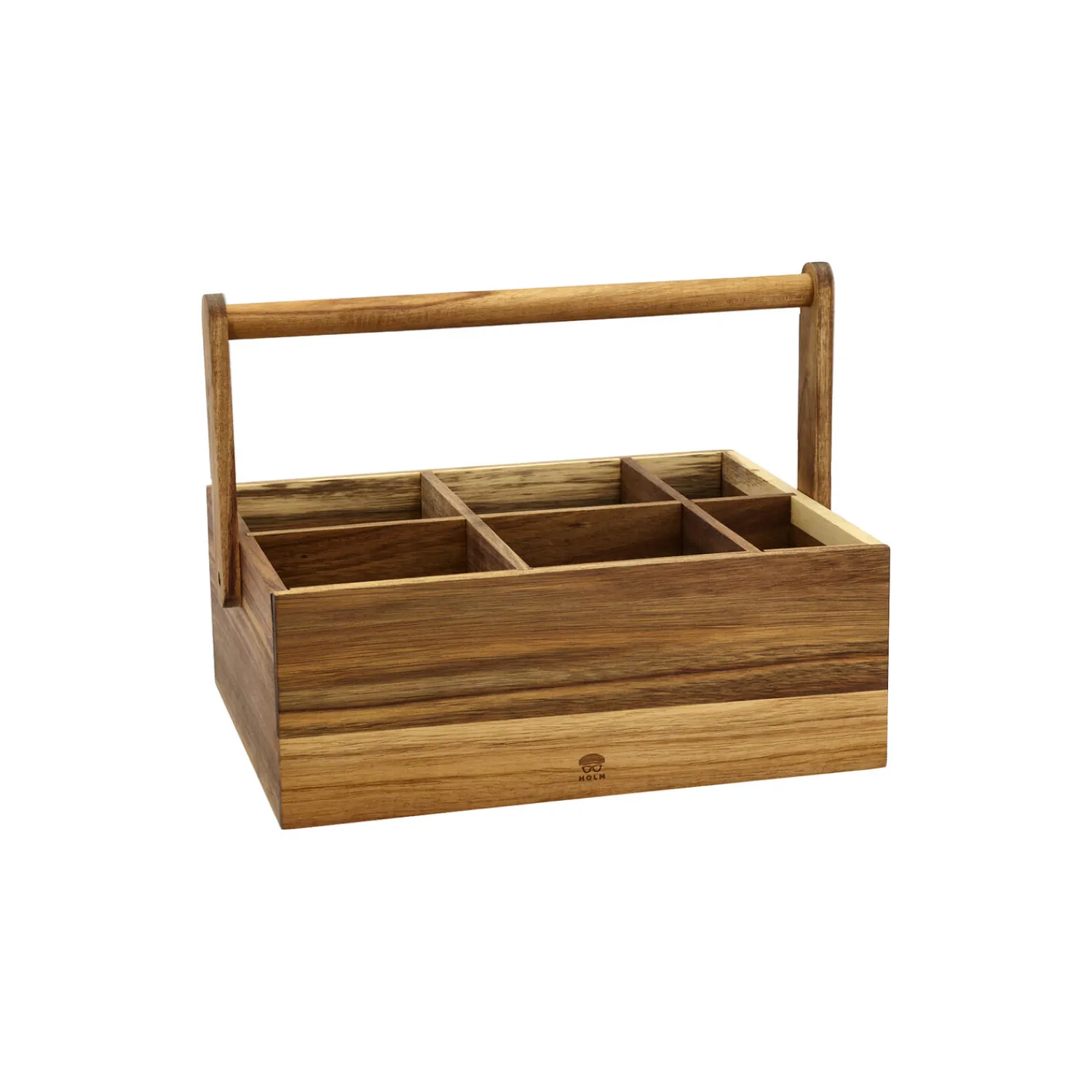 Stor multikasse i oliebehandlet akacietræ med plads til både flasker og tilbehør. Kassen har et solidt håndtag, fire store rum til flasker og to mindre rum til opbevaring af fx proptrækker, vinprop og glasbrikker. Kassen er din ideelle hjælper, når du henter dine favoritvine fra vinkøleskabet eller kælderen til dig selv og dine gæster. 37 x 27 x 28 cm. Varen er produceret i FSC®-certificeret akacietræ (FSC-C166612).