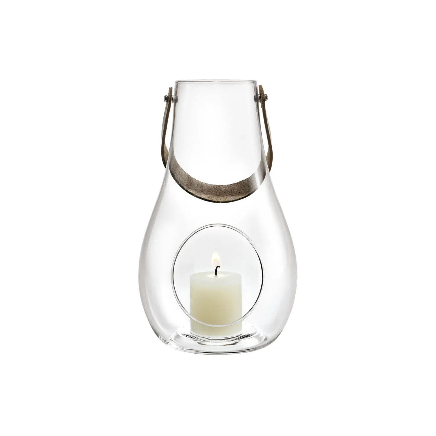 Brug Design with Light XL lanternen året rundt. Til sommeraftener på terrassen, til dekoration på trappen som velkomst til dine gæster – og som en stilfuld juledekoration tilsat et par kogler, gran og kanelstænger i bunden. Maria Berntsen har skabt den mobile lyskilde i glas og kernelæder til at sprede hygge i skandinavisk stil. Denne gulvlanterne er 45 cm høj, og findes også i en lille version på 16 cm, en mellem version på 24,8 cm og en stor version på 29 cm. Lanternerne findes i klart glas og er smukke at kombinere. En god gaveidé til en særlig anledning. Hvert stykke mundblæst glas er unikt og håndlavet af glaspusteren, som omhyggeligt blæser den rigtige mængde luft gennem den smalle pibe. Luftbobler i glasset er derfor uundgåelige og udgør en del af den charme, der kendetegner mundblæst glas.