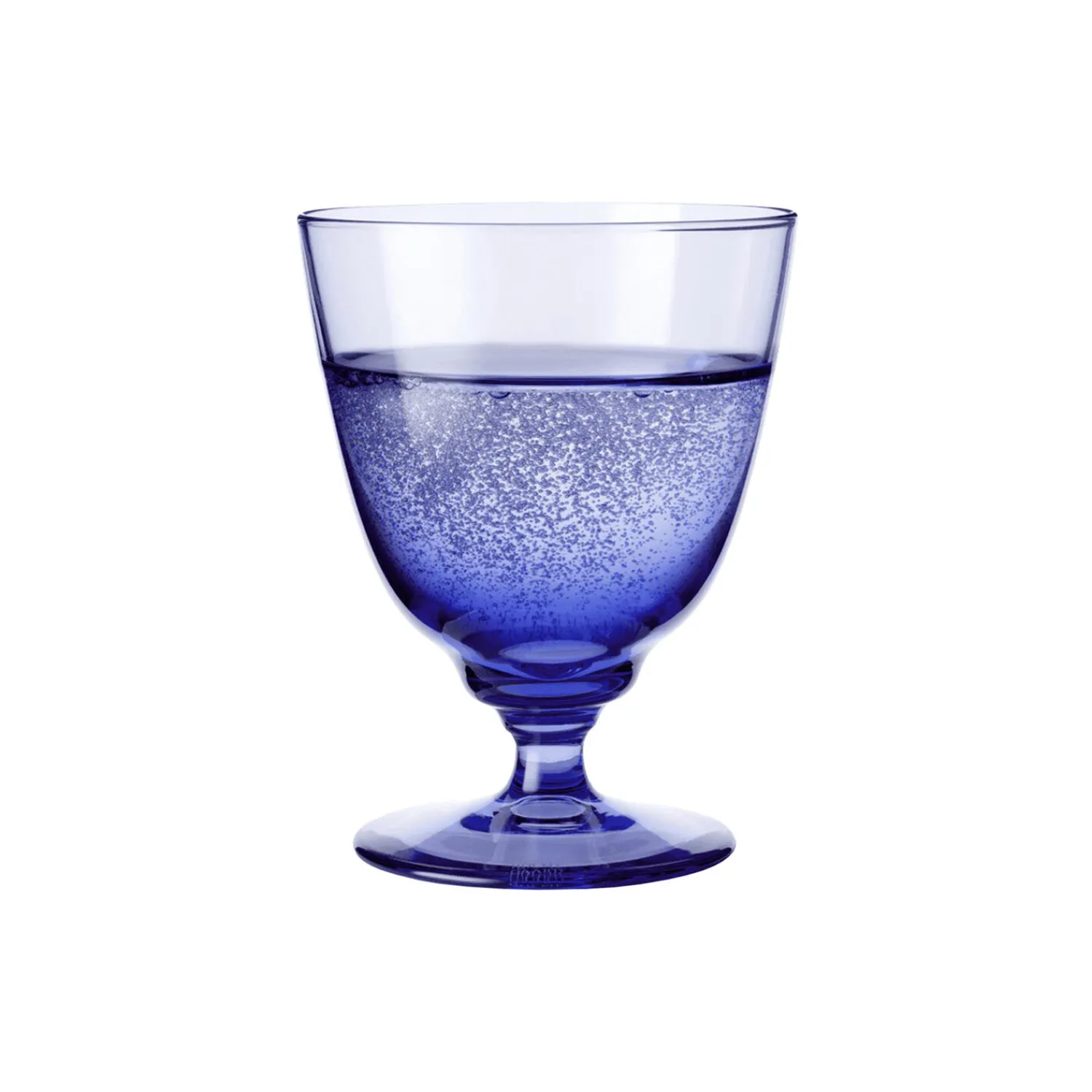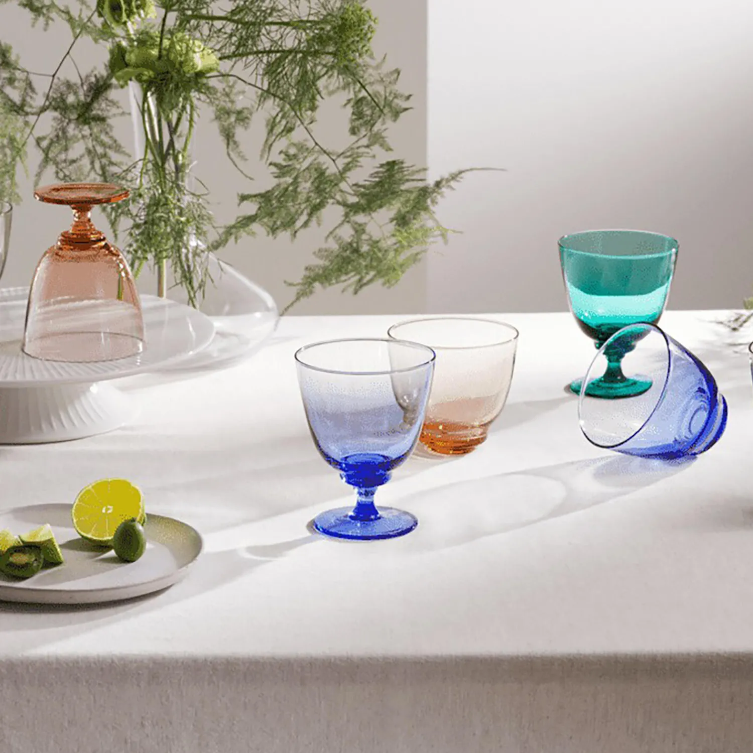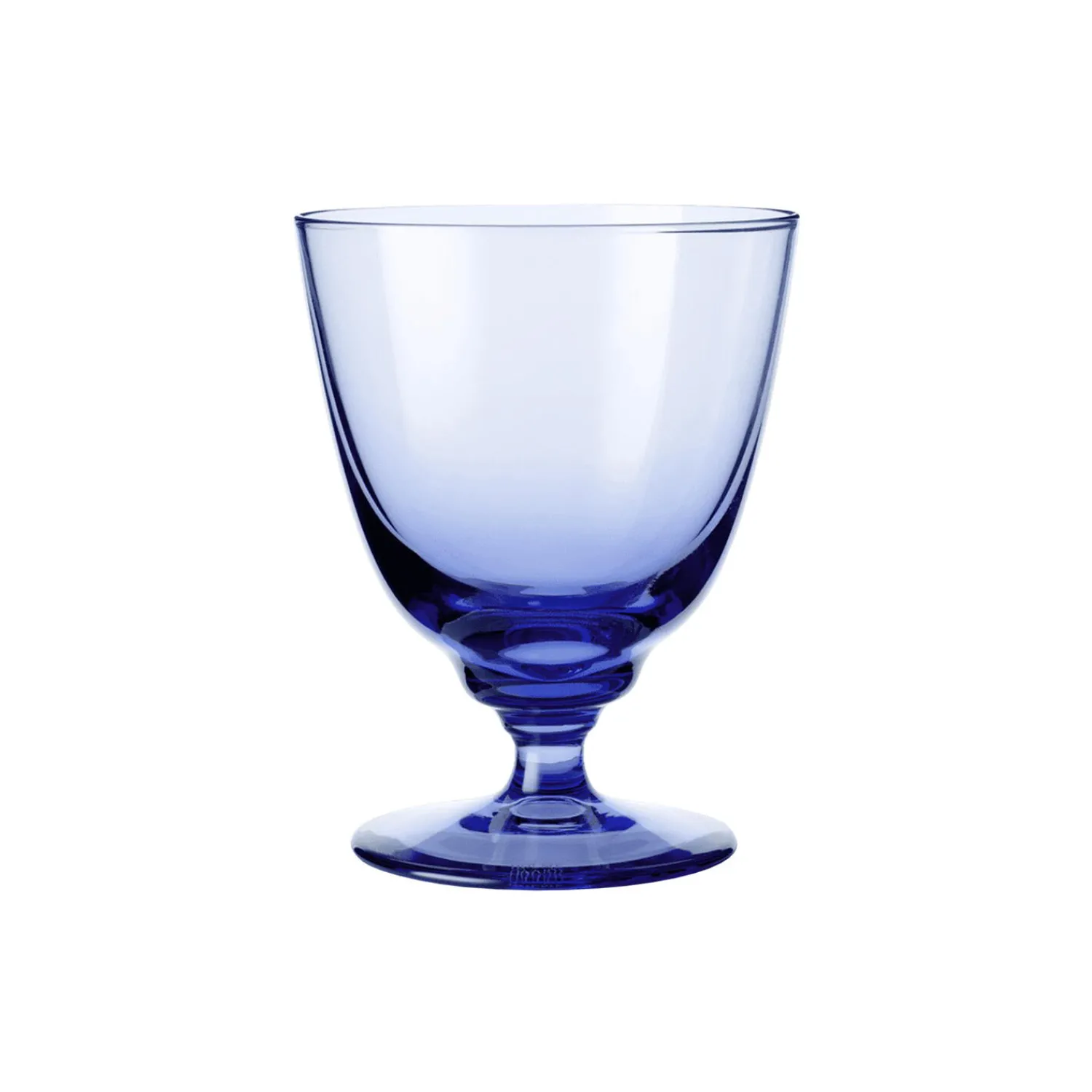 Glasserien Flow giver øjeblikkeligt liv til borddækningen og vækker sanserne på ny. Mundblæst og elegant er serien karakteriseret ved et diskret bølgemønster i bunden, der breder sig som ringe i vandet og tilføjer en organisk og dynamisk følelse til det skulpturelle glasdesign. Vinglasset i mørkeblå rummer 35 cl og skaber et levende og harmonisk udtryk på bordet. Det har samme form som vandglasset i serien, men har fået et lille løft. Inspirationen til det lave vinglas er hentet i Holmegaards arkiver, hvor det i de gode gamle dage var almindeligt med lavere vinglas. I dag betyder den diskrete, lille fod, at vinglasset i Flow-serien fungerer perfekt som et afslappet allround vinglas til rødvin, hvidvin, rosé og alt med bobler. Farven på vinglasset er mest intens i bunden, hvor rillerne er, men har en transparent karakter – også der hvor farverne er stærkest. De nye mørkeblå glas kan sagtens stå alene eller måske endnu mere oplagt – bruges i kombination med de andre farvede glas i serien. Smukt kvalitetsglas fra Holmegaard er for alle og er skabt til at blive brugt – også i hverdagen.