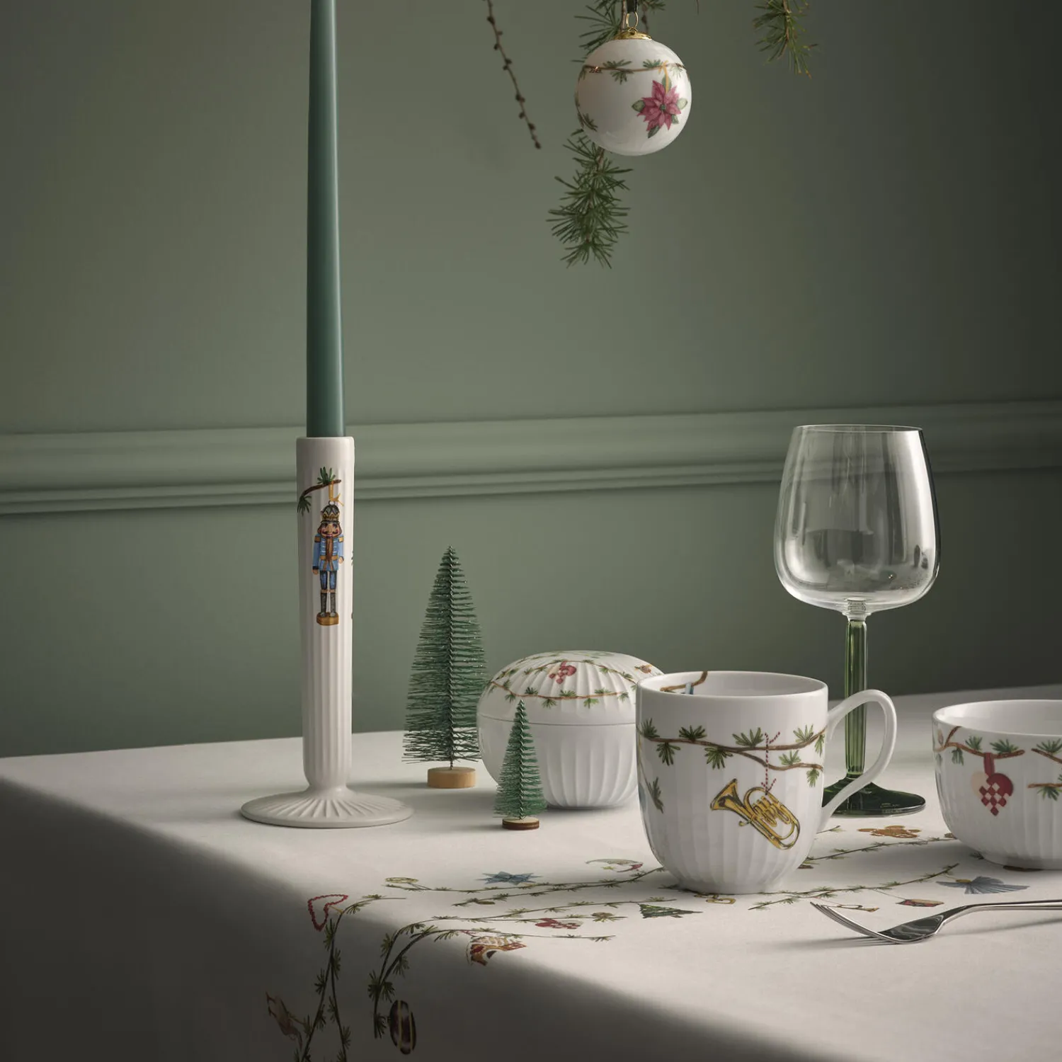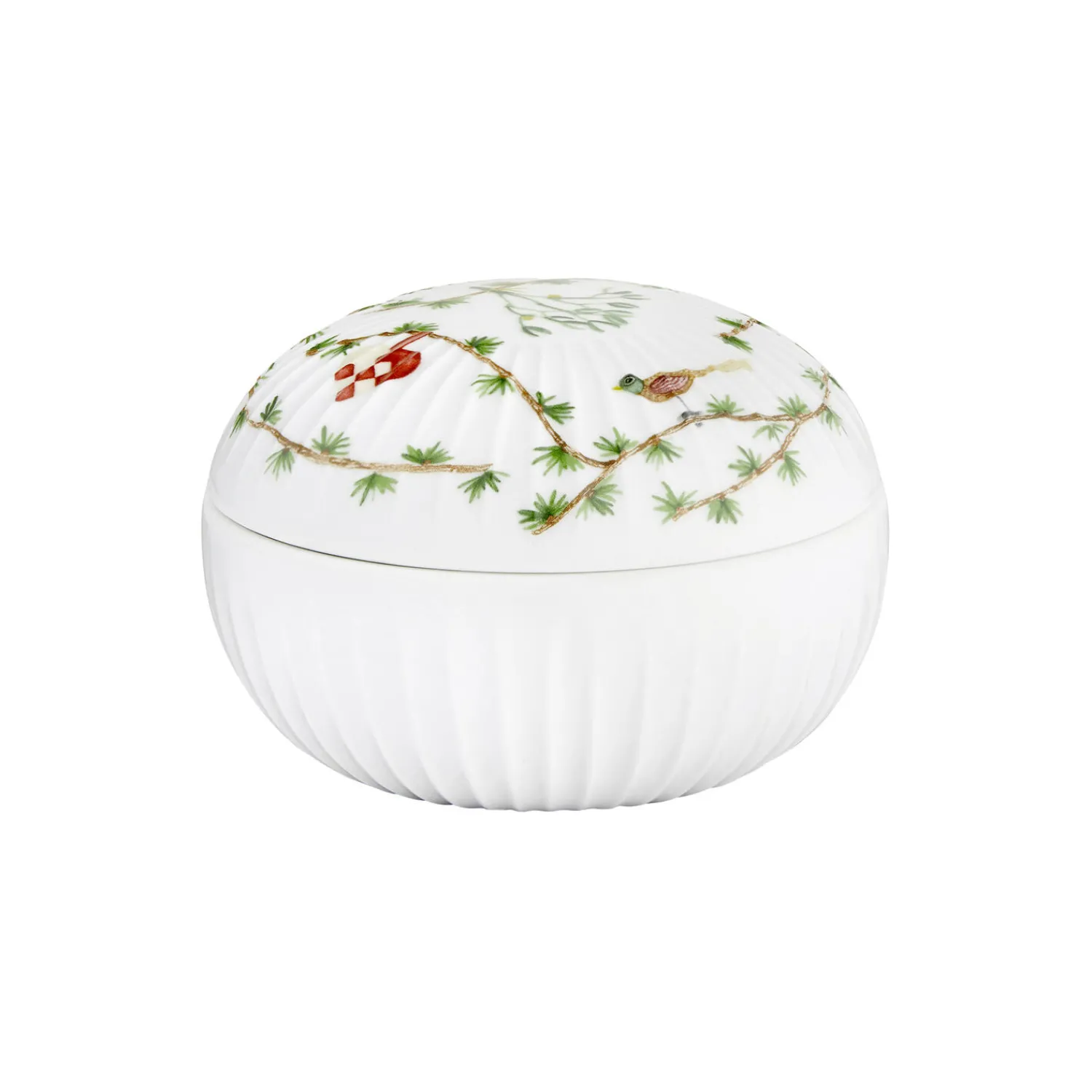 Lad Hammershøi stå for årets julebonbonniere hjemme hos dig. Denne juleserie fra Kähler er designet af Hans-Christian Bauer og Rikke Jacobsen og er en klassisk og stilren serie, der passer ind i ethvert hjem. Her får du årets bonbonniere, der måler 11,5 cm og egner sig perfekt til de skønne juletider. Den er lavet i hvidt porcelæn med en detaljeret udsmykning bestående af grene med små naturdetaljer og ophæng. Det riflede mønster i porcelænet er klassisk for denne Hammershøi-serie, og derved bibeholdes de kendetegn, der følger med denne serie. Du bør altid vaske denne op i hånden for at bibeholde alle detaljer.