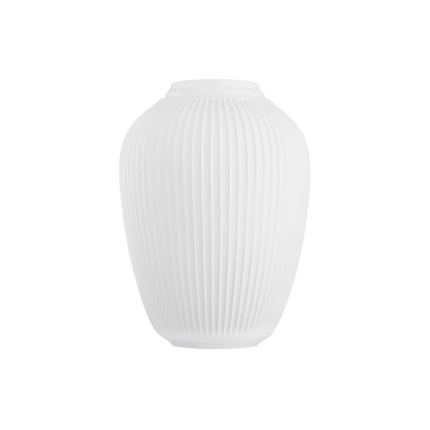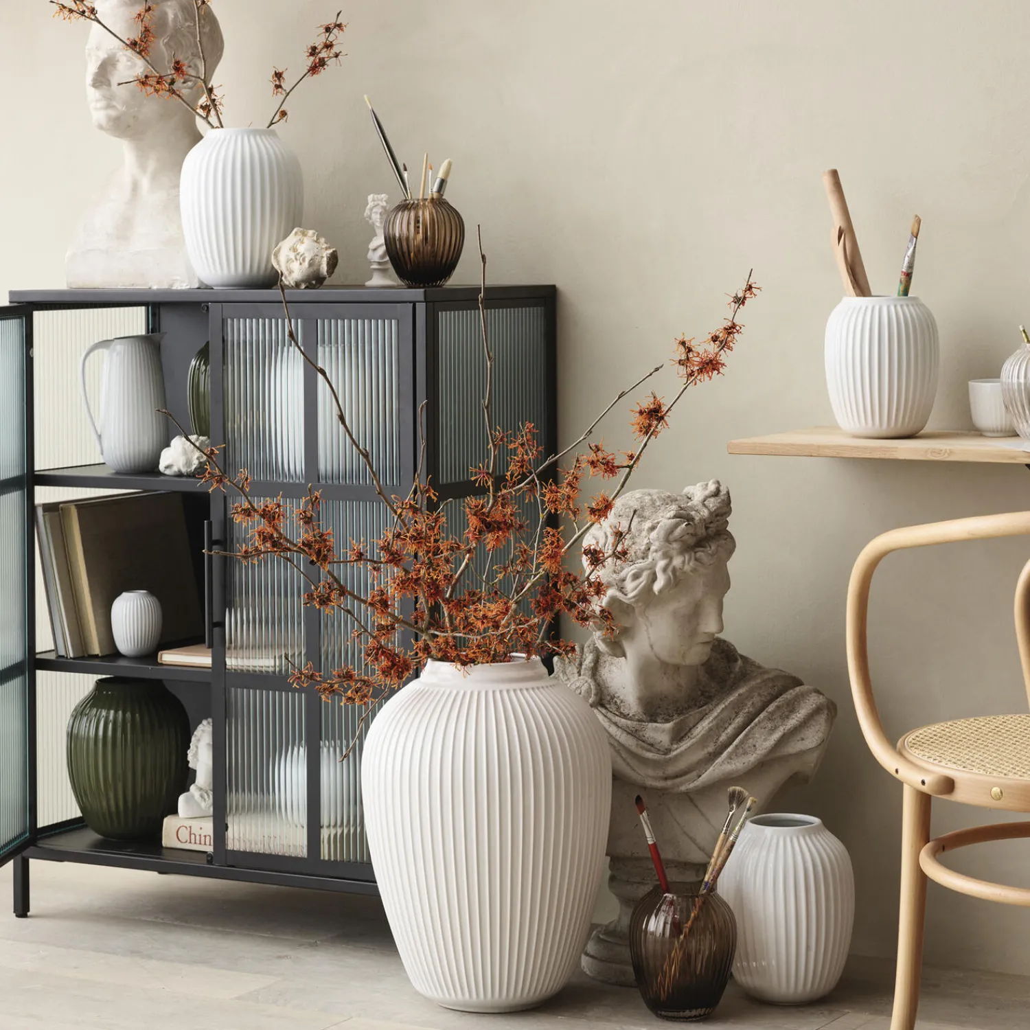 Hammershøi gulvvasen er et nyt, formfuldendt element til din bolig og giver ethvert rum et kunstnerisk og klassisk islæt med sin imponerende fylde. Designet findes i hvid eller antracit fajance med de ikoniske riller og en underspillet krave, der holder blomster og grene smukt på plads. Pynt gulvvaserne med sæsonens grønne grene, elegante enkelte blomster eller lad dem stå alene og udstråle smuk skulpturel elegance.