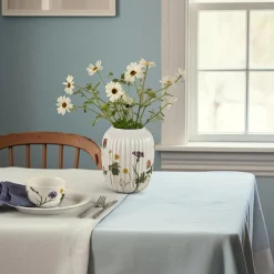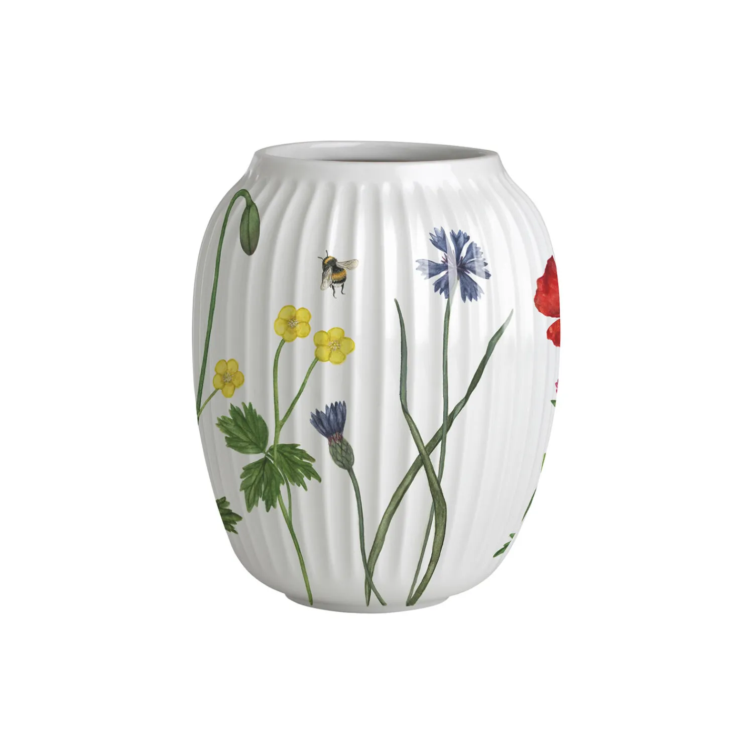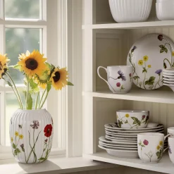 Blomstrende farver, former og følelsen af autentisk sommerstemning. Med Hammershøi Summer fra Kähler kan du næsten mærke solens stråler og den lune sommervind, når du dækker op til kaffe og lidt lækkert på terrassen, altanen eller i sommerhuset. Hammershøi Summer er inspireret af den danske sommers eventyrlige former, farver og følelser, og til 2025-sæsonen har en buket af de smukkeste engblomster fundet vej til den populære serie. Hammershøi Summer-vasen prydet med engblomsttemaet måler 21 cm i højden og er umulig at komme udenom – både når det drejer sig om de farverige Hammershøi Summer-dekorationer af vilde engblomster, og de blomster du selv plukker. Med Hammershøi Summer og engenes blomster er vi med til at bekendtgøre, at sommeren er over os, ligesom engblomsterne kan minde os om at nyde nuet med deres mangfoldige blomstring, der tit ligger som et tæppe over engen, alt imens de lover atter at blomstre igen de kommende år. Engblomsttemaet er malet på samme måde som de andre temaer i Hammershøi Summer-serien, hvor planter og blomster nærmest bevæger sig uvilkårligt hen over de klassiske riller på de hvide keramikdele. Det er som om de nærmest vokser op, ja, næsten danser hen over porcelænet med deres forskellige asymmetriske retninger. Har du allerede andre dele i Hammershøi Summer-serien, vil vasen været et smukt supplement til de øvrige temaer og fuldende en glad og hyggelig sommerstemning på bordet og rundtomkring i hjemmet, samtidig med at du nyder den autentiske nostalgi i Kählers håndlavede designtraditioner. Motiverne er skabt af kunstner Rikke Jacobsen på Hammershøi-stellets eksisterende dele designet af Hans-Christian Bauer. Med sine smukke akvareller skaber hun detaljerige motiver, hvor flora og fauna spiller en gennemgående rolle og indfanger stemningen i naturen og årstiderne omkring os.