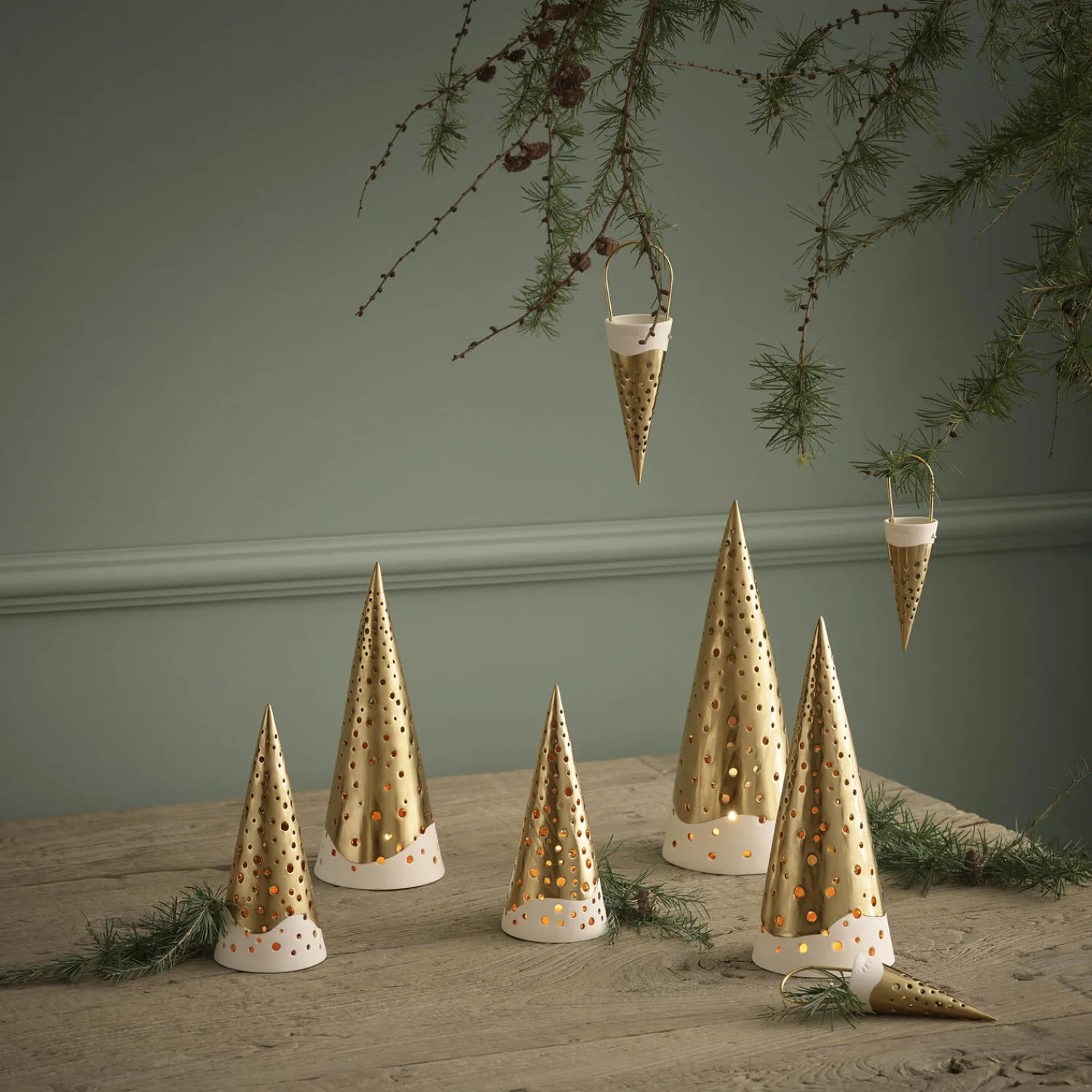 Denne jul har en ny farve i satin-guld fundet vej til Kählers Nobili-serie af kegleformede fyrfadstager og kræmmerhuse, der får et varmt og hyggeligt udtryk med tilføjelsen af denne klassiske julefarve. Kræmmerhusene kommer i to størrelser med hank i messing-look, mens fyrfadsstagerne i serien kommer i tre størrelser. Gennem de håndskårne lyshuller kommer lyset til live og viser sig som silhuetter på hjemmets mange flader. Det er designerne Mette Bache og Barbara Bendix Becker, der har formgivet serien ud fra et ønske om at bringe et legende udtryk til decembers indretning med håndlavede juletraditioner i keramik. Og i designet leges der med den blanke og taktile glasur, som får modspil af den rå, uglaserede keramik, der præger både stager og ophæng.