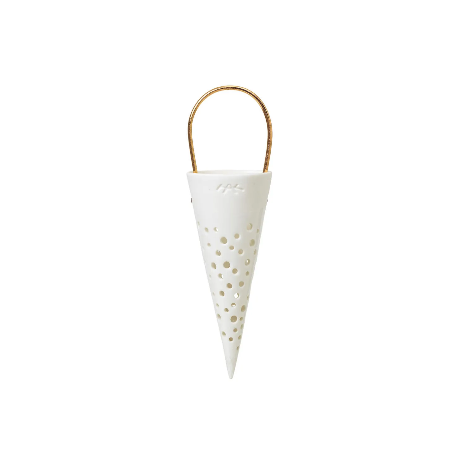 Den smukke Nobili juleserie er som skabt til at få julestemningen ind i stuerne på en moderne, diskret måde. I år tilføres serien to størrelser kræmmerhuse i snehvid og olivengrøn, i henholdsvis H14,5 cm og H18cm. Kræmmerhusene er fremstillet i benporcelæn med blank olivengrøn eller snehvid glasur m. blank guld metalbøjle og passer perfekt som pynt i alle julehjem. Kræmmerhusene er en videreførsel af Nobili juletræer, og har de mange håndskåret små dekorative huller. Kræmmerhusene er udelukkende til ophæng og dekoration. Kræmmerhus hører til på juletræet, og traditionelt skal det fyldes med godter, f.eks. pebernødder eller bolsjer. Kræmmerhuset hører til blandt de ældre former for juletræspynt, og hænger naturligvis sammen med tanken om at pynte træet med spiselige genstande. Designet af designduoen R7B – Mette Bache og Barbara Bendix Becker