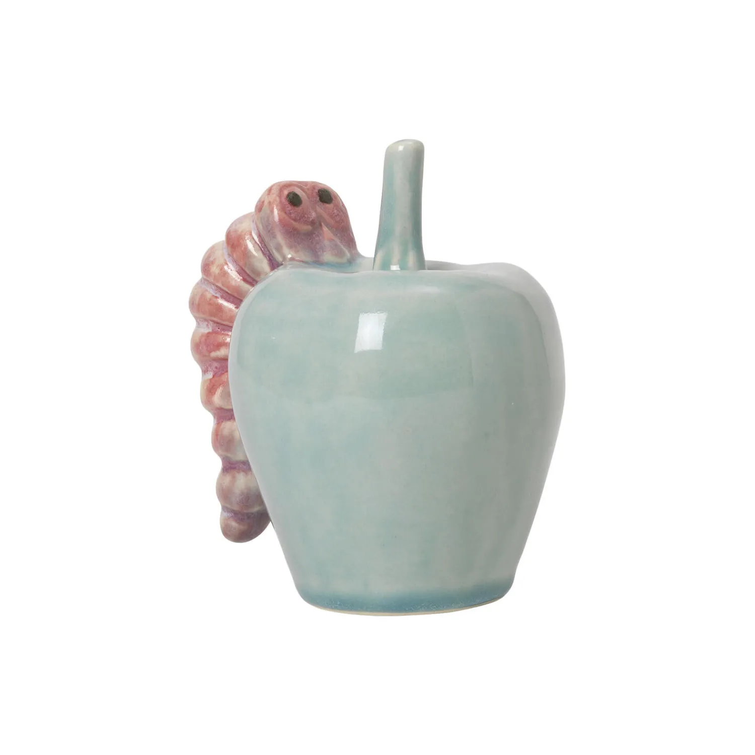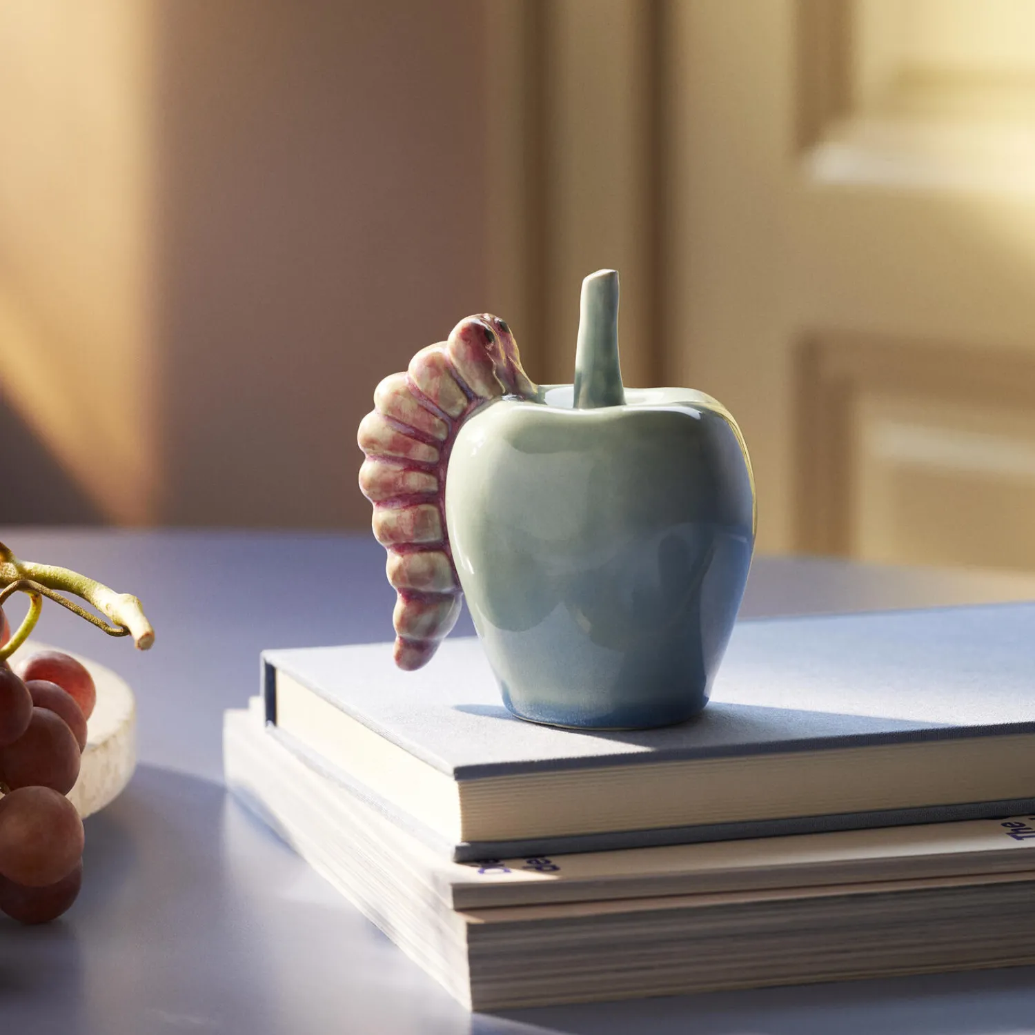 Farverig popkultur møder håndlavede designtraditioner i samarbejdet mellem Kähler og designduoen KIMPOP, der tæller tv-personlighederne Sofie Linde og Joakim Ingversen. I en årrække har duoen med stor passion udforsket keramikkens verden, og deres viden om glasurer, brænding og det keramiske håndværk forener de med deres kærlighed til pop og populærkultur med udgangspunkt i de sene 80’ere og tidligere 90’ere, som de selv er rundet af. Og resultatet? Kollektionen Pottery, der er lige så farverigt som Sofie og Joakim. KIMPOP ønsker at udfordre danskernes brug af farver i indretningen, bryde med de traditionelle skandinaviske farvetraditioner og invitere os til at tage flere farverige chancer i indretningen. Den nye kollektion fra Kähler X KIMPOP er et selvsikkert mix af pasteller, opulente glasurer, humoristiske detaljer og former, der vil frem i verden. Æblet på 10 cm i højden i pastelgul har en herlig mintfarvet orm på toppen. En lille finurlig figur, du ikke vidste, du manglede. En skæv og sjov del af Poppery-kollektionen og et perfekt eksempel på KIMPOPs humoristiske tilgang til keramik og design.