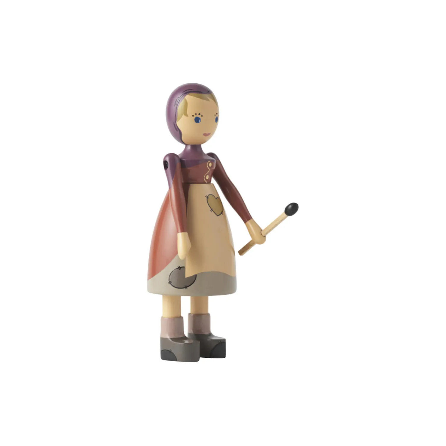 Lad eventyret leve videre gennem originale fortællinger i træ. I Odense åbnede i 2021 museet H.C. Andersens Hus, og i den forbindelse indledte museet og Kay Bojesen Danmark et samarbejde, så det nu ville være muligt at finde nogle af de mest kendte og elskede figurer fra de verdensberømte eventyr fortolket i Kay Bojesens univers af originale fortællinger i træ. Nattergalen, Hyrdinden & Skorstensfejeren og Ole Lukøje var de første til at flytte ind på hylderne i museumsbutikken i Odense – og selvfølgelig også i din lokale designbutik. Og nu har Den lille Pige med Svovlstikkerne også fundet ind i varmen. I Kay Bojesens fortolkning er hun iklædt en hætte, der går ned over skuldrene. Hun har lapper på kjole og forklæde, som er holdt i nedtonede farver, der understreger, at den lille pige kommer fra fattige kår. Hendes lune smil og milde og uskyldige udtryk er affødt af de smukke oplevelser, hun ser for sit indre blik i lyset fra flammerne, hvor hun en kold nytårsaften får vækket fantasien med nogle fantastiske drømmesyn fyldt med glæde og tryghed. I hånden holder hun en svovlstik, der fuldender fortællingen. Den Lille Pige med Svovlstikkerne måler 14,5 cm i højden og er drejet i FSC®-certificeret bøgetræ, og den manuelle produktion med maling og tryk er udført med den store præcision og omhyggelighed, der kendetegner træfigurerne fra Kay Bojesen. Formen er baseret på den originale Lise-figur fra Kay Bojesens arkiv, der er enkel og minimalistisk, men fuld af liv og sjæl. Det giver Den Lille Pige med Svovlstikkerne den følelse af magi og eventyr, der er i tråd med Kay Bojesens ånd og den historiefortælling, han formåede at skabe, når han designede sine fantasifulde figurer.