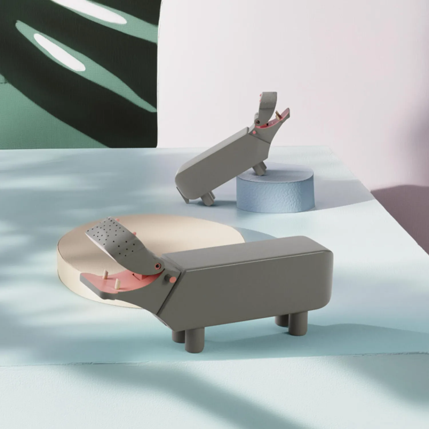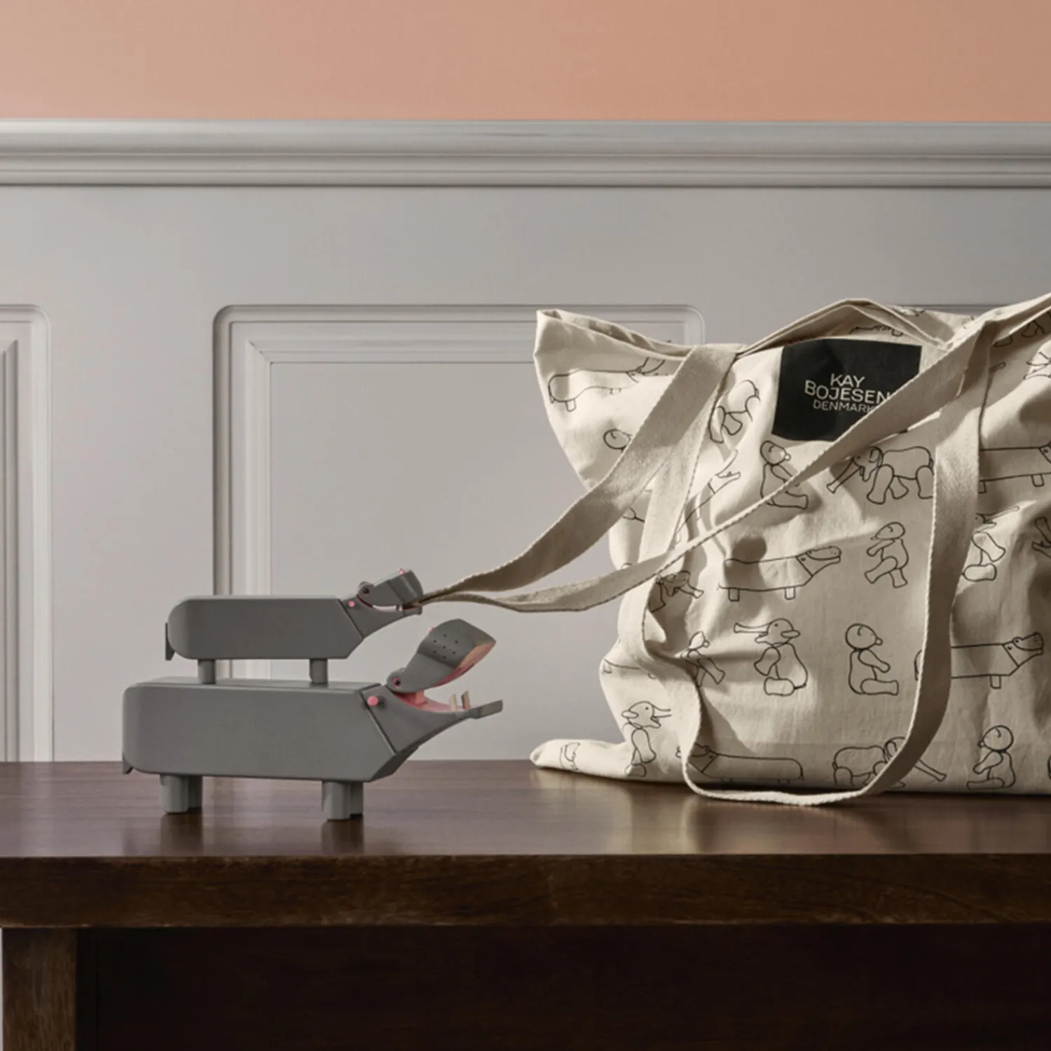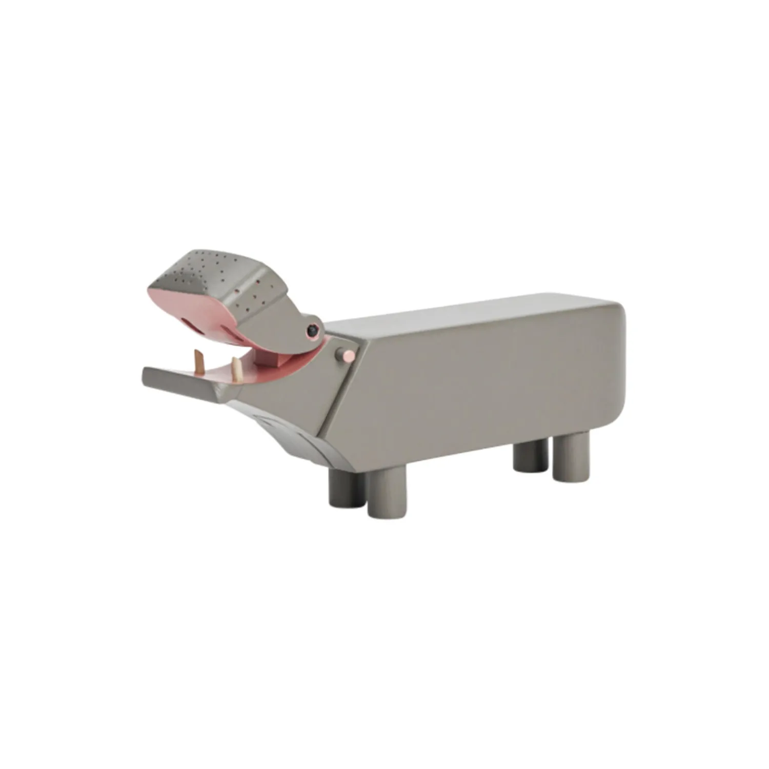 En charmerende sværvægter fylder 70 år. Med sit åbentstående gab og finurlige udtryk er Flodhesten en figur, man elsker ved første øjekast. Den er næsten for sjov til at være sand, og det er nemt at forstå, hvorfor Kay Bojesen lod sig inspirere af en af dyrerigets mest originale karakterer, da han skabte sin kendte og elskede Flodhest tilbage i 1955. I modsætning til de fleste andre af Kay Bojesens trædyr, der oftest ses i bløde og runde former, er Flodhesten noget mere firskåren i designet med overvejende rette og lige linjer – til gengæld brillerer den med et stort og kærligt smil og masser af power og glimt i øjet. Og så har Flodhesten det der umiskendelige udtryk af omsorg og harmoni. Ja, det er nærmest som om, at den stærke træfigur kommunikerer, ‘stol trygt på mig, jeg har altid din ryg’. Ifølge arkiverne havde Kay Bojesen selv en grå flodhest stående på sit skrivebord, og den runde fødselsdag fejres med to jubilæumsudgaver i FSC®-certificeret bøgetræ malet i en eksklusiv grå farve – en rigtig flodhestefarve – mens det store gab malet lyserødt. Uanset om du vælger denne Liliput-udgave på 6 cm eller den lidt større jubilæumsversion på 9 cm i højden, så får du håndlavet kvalitet i et elsket legende og tidløst design, hvor Flodhestene med deres venlige udtryk, de runde øjne og den lange stærke form vil tilføje et strejf af hygge og varme til ethvert rum. Brug dem for eksempel som små overraskende designelementer i boligen, der titter frem, hvor man mindst venter det. De to grå Flodheste produceres kun i 2025 og vil derfor også være oplagte som den unikke gave til dåb, fødselsdag, studentergave, bryllup – eller det store jubilæum.