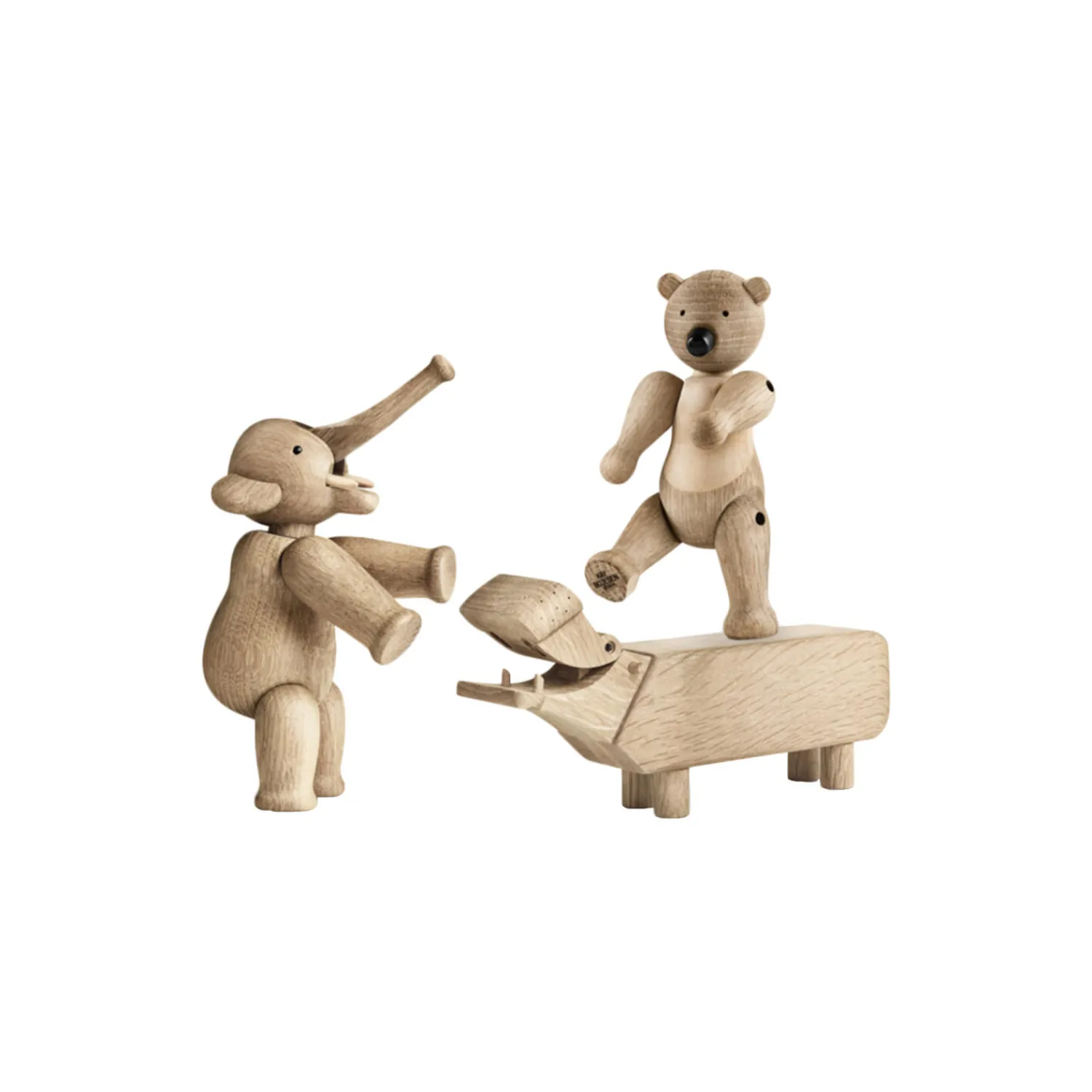 Store ikoner. Små størrelser. Under overskriften Liliput kan du nu skabe originale fortællinger i træ med tre af Kay Bojesens berømte træfigurer i en endnu mindre ministørrelse, hvor de smilende linjer i de små miniatureudgaver slet ikke kan undgå at få de helt store smil frem hos alle, der elsker klassisk dansk design. Mød Bjørnen på 9,5 cm, Elefanten på 7,5 cm og Flodhesten på bare 6 cm i højden. Liliput Bjørnen står ligesom sine større søskende klar med sine karakteristiske åbne arme og venlige udtryk. Og selvom den er lille, så kan Liliput Bjørnen stadig både dreje hovedet og bevæge armene, så du kan stille, sætte eller lægge den, nøjagtig som du ønsker. Også Elefanten med sin lange snabel og søde ører har i Liliput-versionen samme indbydende runde form som originalen fra begyndelsen af 50’erne, hvor Kay Bojesens elefantfigur kom til verden på Kunsthåndværkets Forårsudstilling. Flodhesten blev født i 1955 som et muntert indslag til at holde styr på blyanten på skrivebordet, og den vil stadig skabe smil og stil som Liliput på kontoret eller på børneværelset. Alle Liliput-dyrene er fremstillet i FSC®-certificeret egetræ, der garanterer, at træerne til produktionen er plantet, dyrket og fældet ansvarligt. Liliput Bjørnen har desuden detaljer i FSC®-certificeret ahorn, der er med til at understrege Bjørnens bløde formsprog. Dyrenes enkeltdele er drejet, slebet, pudset og poleret, så de både ser smukke ud og føles rare at røre ved. Selvom dyrene er blevet mindre, er det store håndværksmæssige arbejde bag hver enkel Liliput-figur det samme som altid, og den høje kvalitet i materialer, udformning og finish lyser ud af de tre små venner, der i denne unikke sampak med alle Liliput-figurerne er den helt oplagte gaveide til alle, der sætter pris på original dansk formgivning og design som Kay Bojesen er kendt for – uanset om det er til det store jubilæum eller den lille børnefødselsdag. Stor, lille, mini eller Liliput så har Kay Bojesens familie af trædyr en helt særlig appel til både børn og voksne. En træfigur er ikke en gave, der bliver glemt, men bliver en kær ven, der flytter med gennem hele livet – lige fra børneværelset til egen bolig i voksentiden. Noget som designikoner af en vis kaliber kan uden at miste relevans.