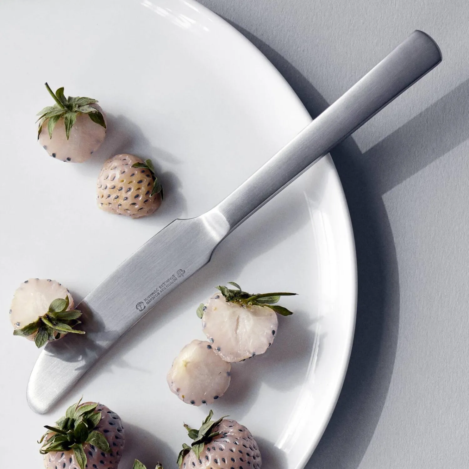 Kay Bojesen har med Frokostkniven lavet en tro kopi af Middagskniven, blot kortere, lettere og uden grillskær, men med samme buede blad. Pegefingeren hviler på den bløde bue, der forener skaft med klingen og design med funktionalitet. Kniven er perfekt til tapas, forretter og osteanretninger. Den ligger tilmed godt i den lille barnehånd, der skal lære at bruge kniv og gaffel. Frokostkniv på 18 cm designet af Kay Bojesen. Fra serien “Grand Prix” i mat rustfrit stål.