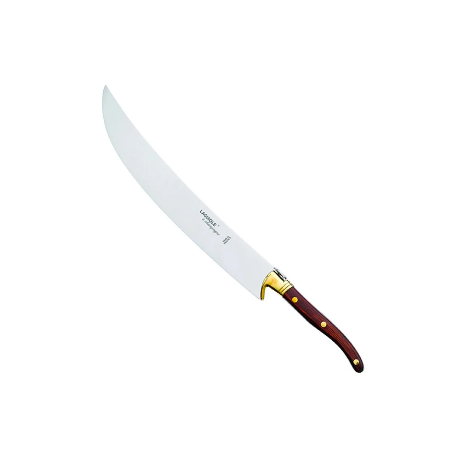 Laguiole Tradition champagnesabel i tål, krave i messing og skaft i rød stamina fra Laguiole Tradition.