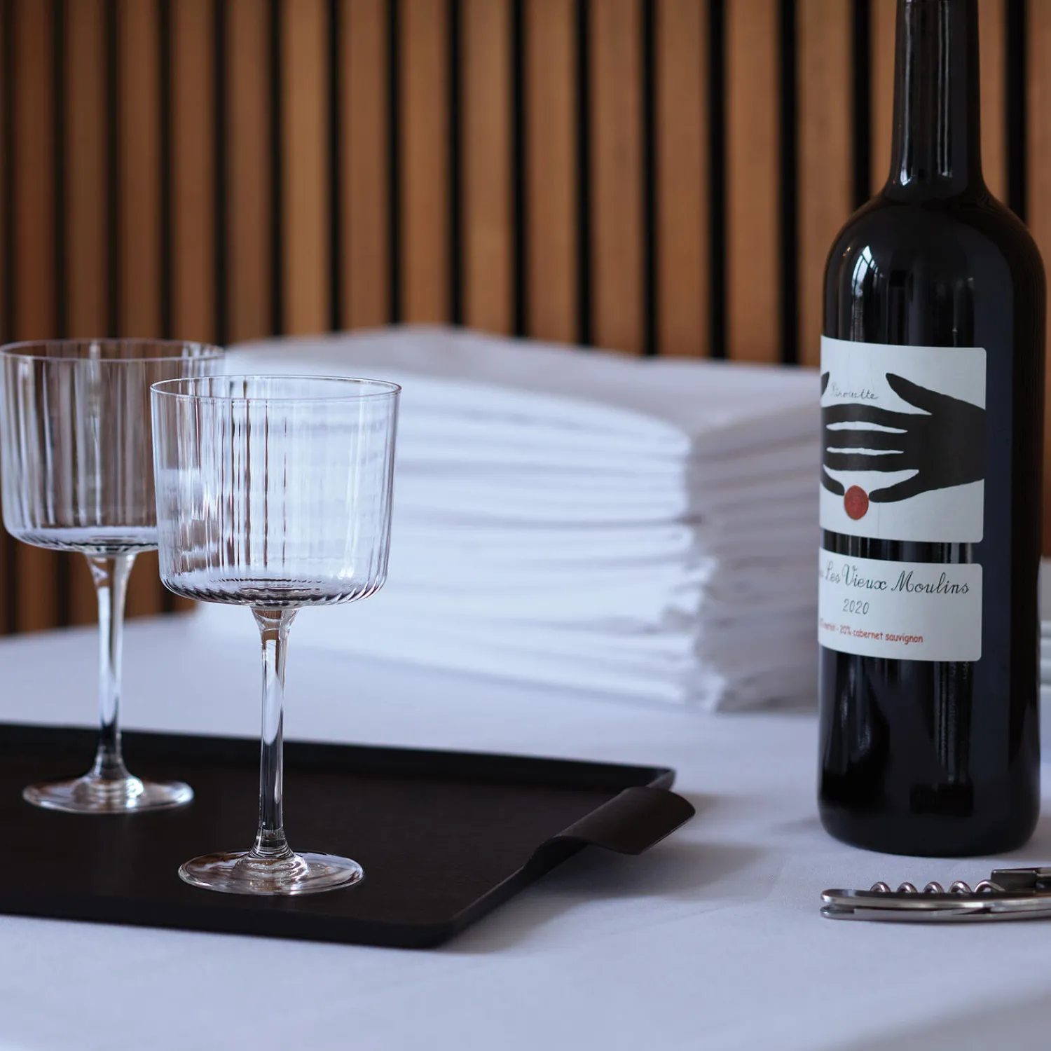Et sæt af 4 stk. vinglas med rene linjer, bløde firkantede kanter og parrede bagsidesilhuetter. Den lineære, teksturerede finish fremhæver Gios rene, moderne design, og ideel til både rød, hvis og rosé.