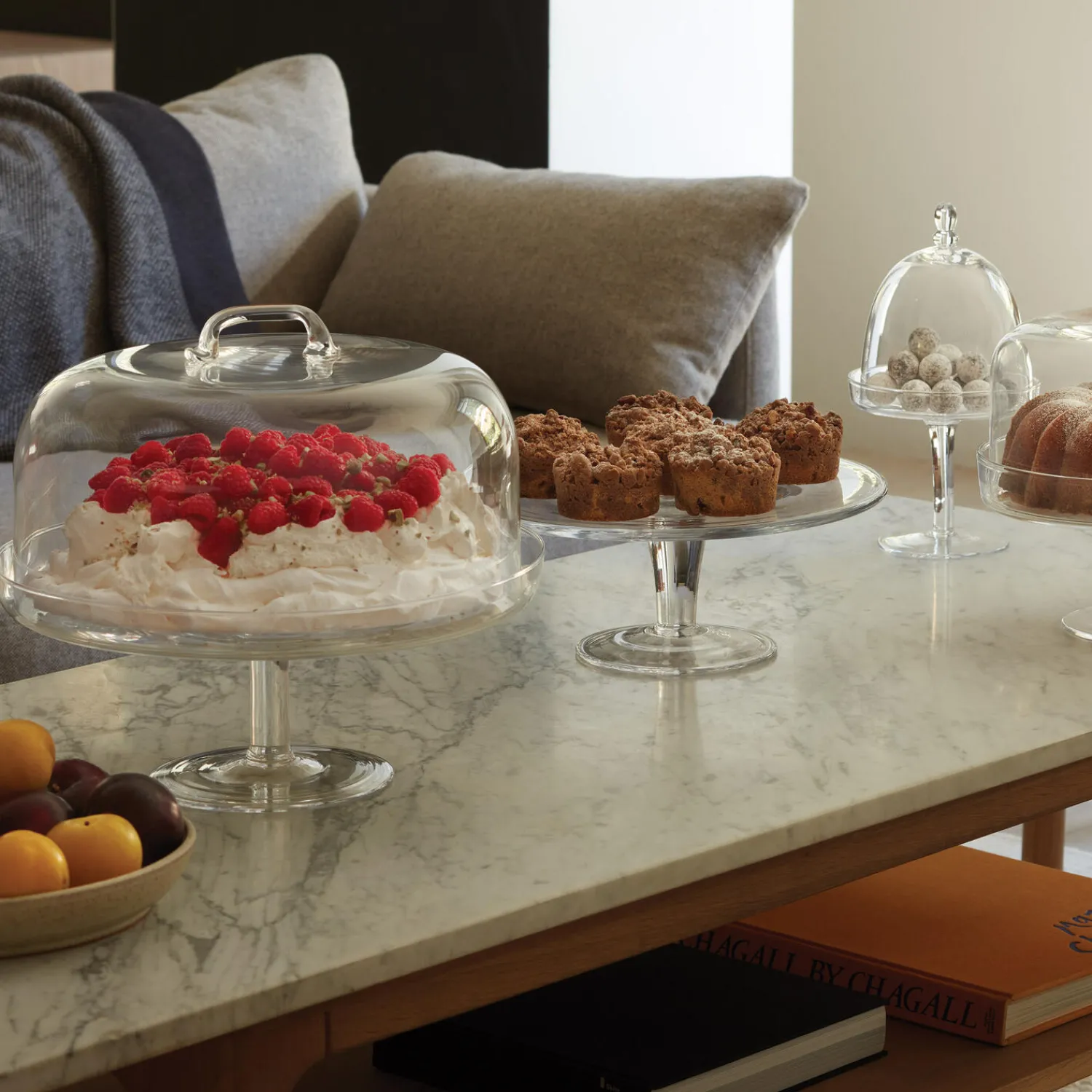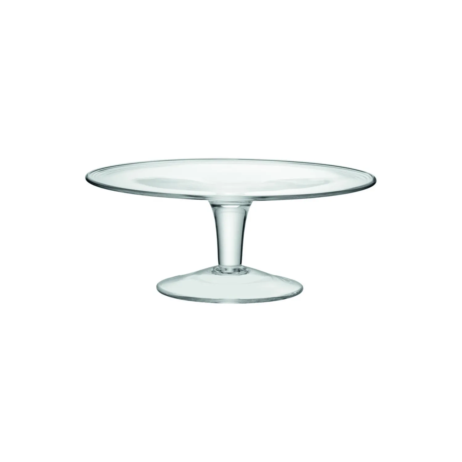 Et mundblæst kagefod af glas med sakseskåret kant på bred tallerken, tyk tilspidset stilk og bred fod. Til kager, muffins eller kiks.