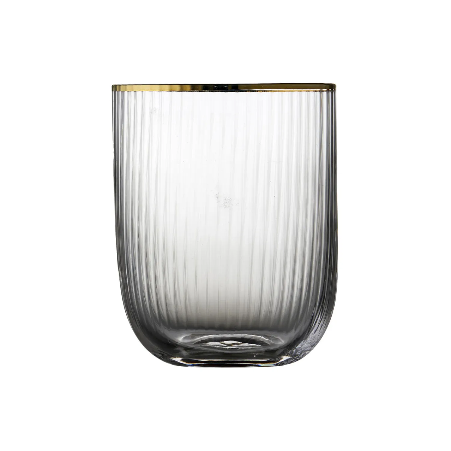 Smuk tumbler med bløde, rundede former. Det elegante, riflede design med en fin guldkant giver glasset et flot vintagelook, der samtidig afspejler tidens trends. Server vand, juice eller drinks i glasset og lad de fine facetter reflektere lyset og glassets indhold på smukkeste vis.
