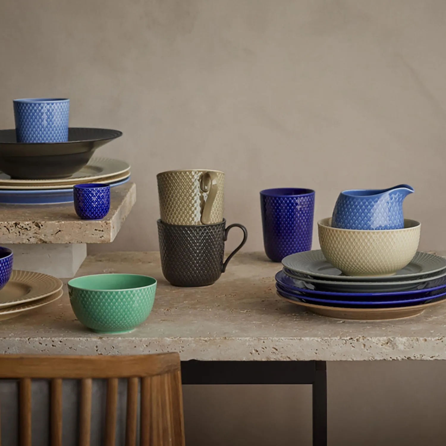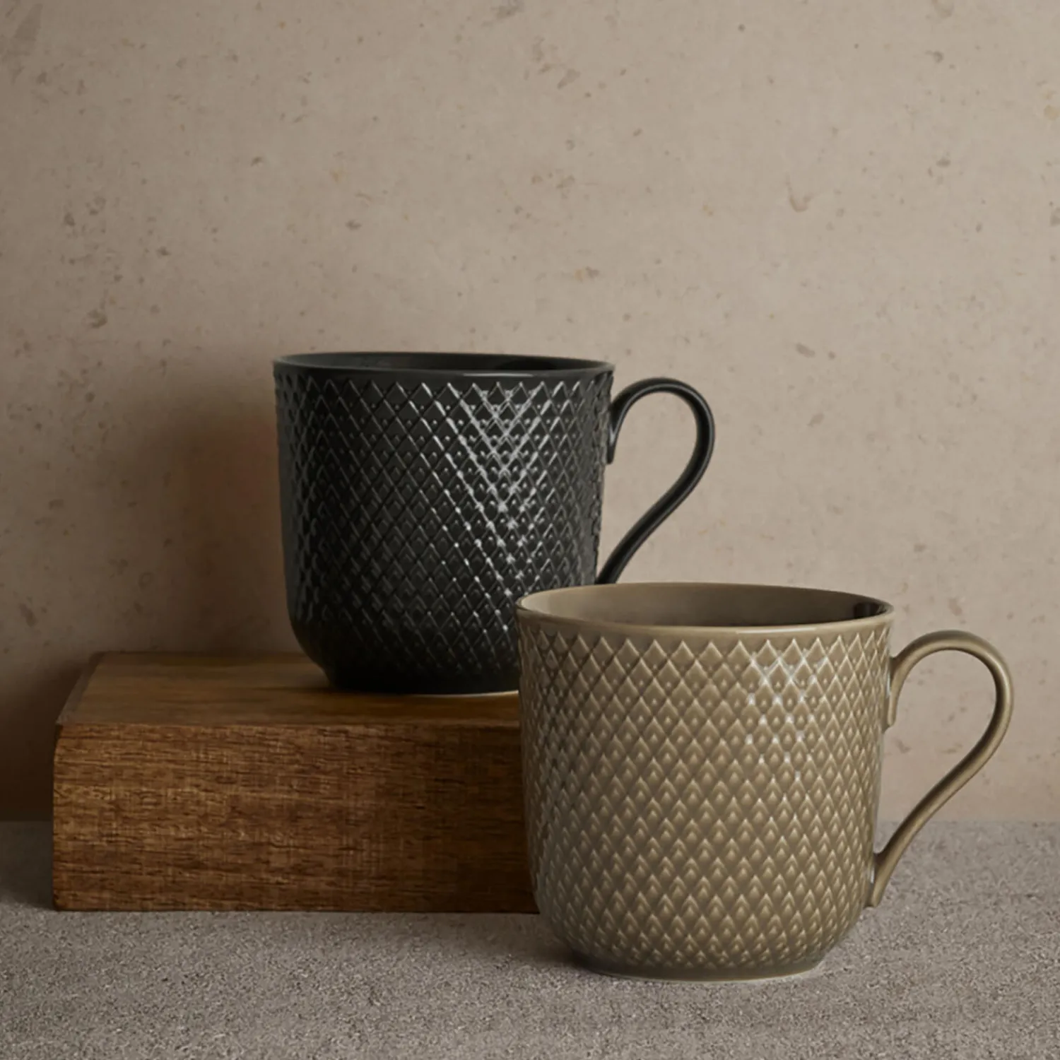 Et jordnært og nærværende udtryk på bordet og i hånden. Med en farvepalet i fire elegante jordfarver inviterer Rhombe Earth os til at sætte farten ned, være nærværende omkring det vi spiser og drikker, dem vi spiser med og at lægge mærke til skønheden i det stel, vi spiser og drikker af. Seriens krus på 39 cl er perfekte til en stor kop kaffe, te eller varm kakao og kommer ud over denne mørkegrå slate også i de tre andre Rhombe Earth-farver – marble, clay og moss – afdæmpede jordfarver der bringer Rhombe-stellets ikoniske reliefmønster frem på en ny og anderledes måde og indbyder til, at vi går et lag dybere og giver opmærksomhed til din drik i kruset og maden på tallerkenen, til sanserne og til samtalen med de andre omkring bordet. Alle Rhombe Earth-seriens fire smukke nuancer er ligesom i Lyngby Porcelæns populære Rhombe Color-serie nøje udvalgt af designduoen Stilleben, der består af Ditte Reckweg og Jelena Schou Nordentoft. Brug alle de forskellige Rhombe Earth-dele sammen i din borddækning og lad de forskellige størrelser tallerkener titte frem under hinanden, så de lune farver får lov at tale sammen. Tallerkenerne, krusene og skålene i Rhombe Earth er selvfølgelig også både sammen og hver for sig oplagte som supplement til din Rhombe Color-samling eller i kombination med det klassiske hvide Rhombe-stel, hvor de grå og brune nuancer på de enkelte Rhombe Earth-dele sammen med Lyngby Porcelæns linjer til perfektion vil skabe et både moderne og afslappet udtryk og stå smukt op imod det hvide porcelæn.
