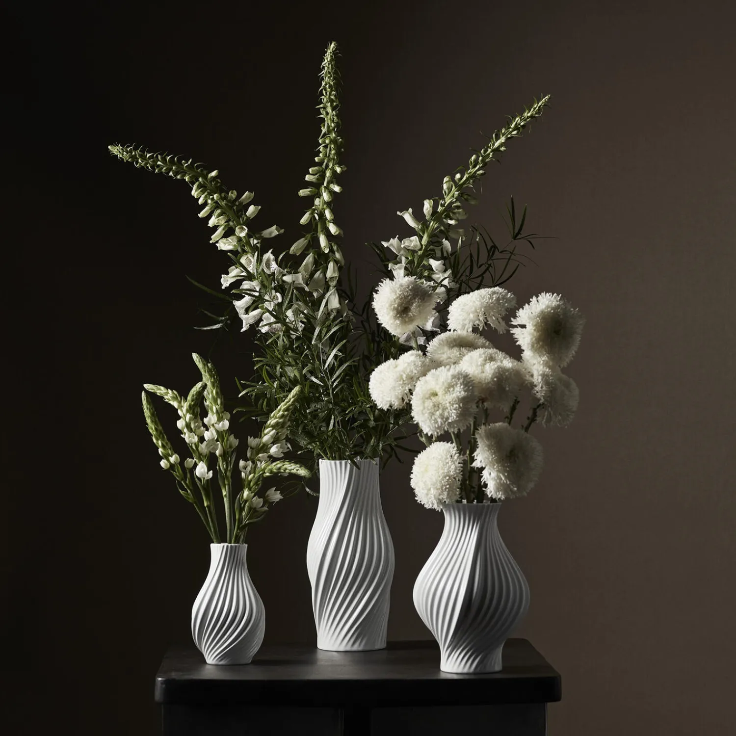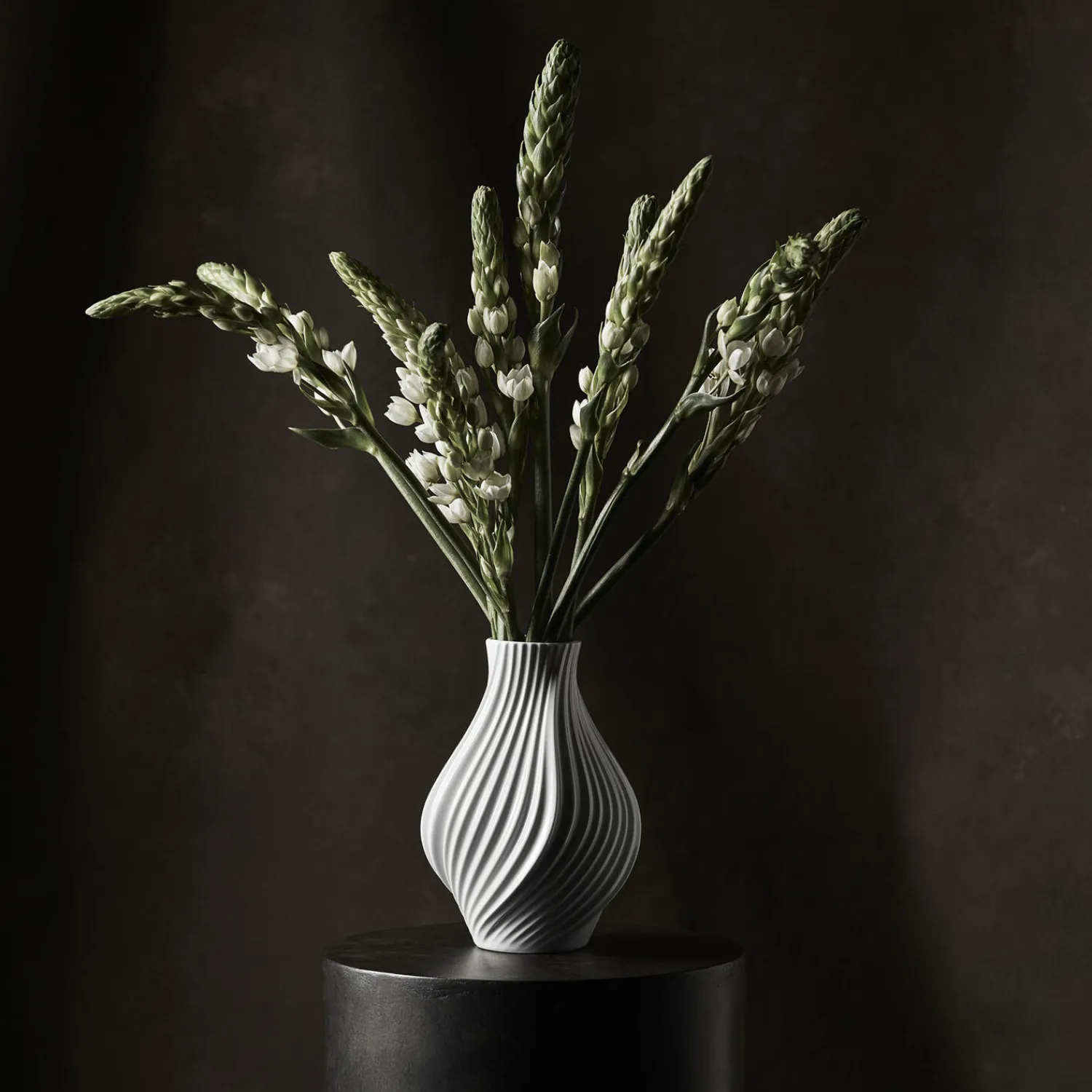 Et elegant møde mellem natur og kultur. Med Lyngby-seriens unikke Twist-vaser får du enkel, stilren og skulpturel porcelænsmagi, som vi kender det fra Lyngby Porcelæn, hvor arkivdesign, klassiske former og rendyrket æstetik udfoldes med i et formfuldendt designtwist med linjer, der inspirerer. Lyngby-designet er i dag veletableret som en sand klassiker i Lyngby Porcelæns sortiment – alle dele med de inspirerende linjer, der karakteriserer Lyngby Porcelæns minimalistiske og stilfulde design og giver Lyngby-serien sit helt særlige udtryk. Med Twist tager Lyngby Porcelæn et par stilige sving ad helt nye designveje og giver dig en vase inspireret af de naturlige formationer, du finder i naturen – barken på et træ, spiralformede galakser, svungne blomsterstængler og fortidsskabte formationer i landskabet. Ud over denne vase på 18 cm i højden findes Twist-vaserne også i størrelser på 25 cm og 31 cm, der matcher resten af Lyngby-serien. Som samlet serie komplimenterer de naturligvis hinanden perfekt, men de kan sagtens stå alene som skulpturelle designelementer forskellige steder i indretningen. Uanset størrelse og placering vil de alle være et lille, mellem eller stort statement i hjemmet, og med årstidens grene eller buketter kommer deres dynamiske form måske endnu mere til sin ret. Det giver en skøn tilføjelse af en naturlig ro og harmoni, men uden at det på nogen måde overtager vasernes karakteristiske formsprog. De kommer selvfølgelig alle sammen med det ikoniske logo i bunden, der sikrer dig, at du har fat i det ægte vasedesign – det fra Lyngby Porcelæn.
