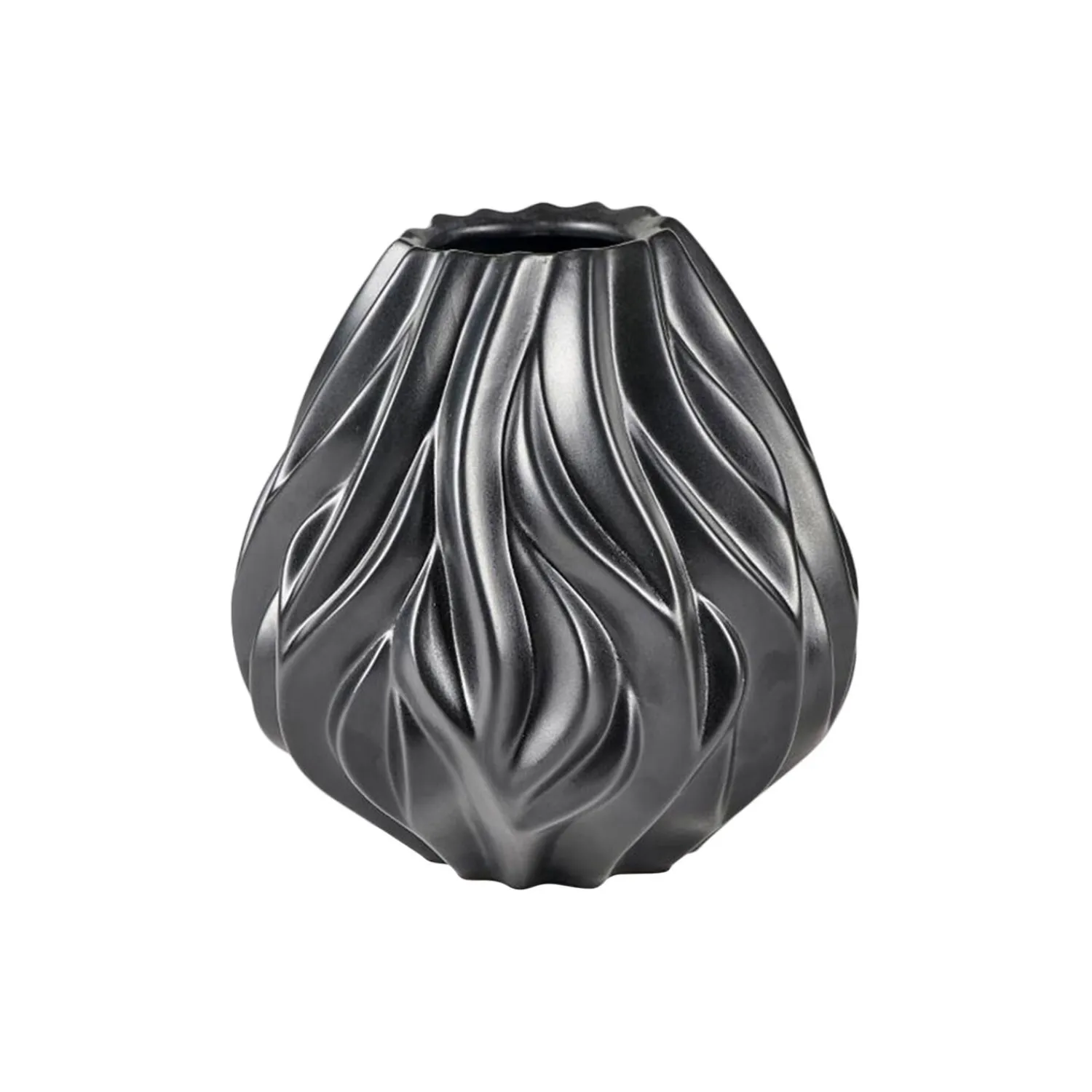 Flame vase, 19 cm høj, i porcelæn med en smuk blå glasur. Vasens organiske mønster leder tankerne hen på ild og flammer. Vasens form og skyggespillet i mønsterets fordybninger, der løfter sig opad på samme måde som ild, gør den smuk og skulpturel – både med blomster og uden, som et dekorativt indretningselement i hjemmet.